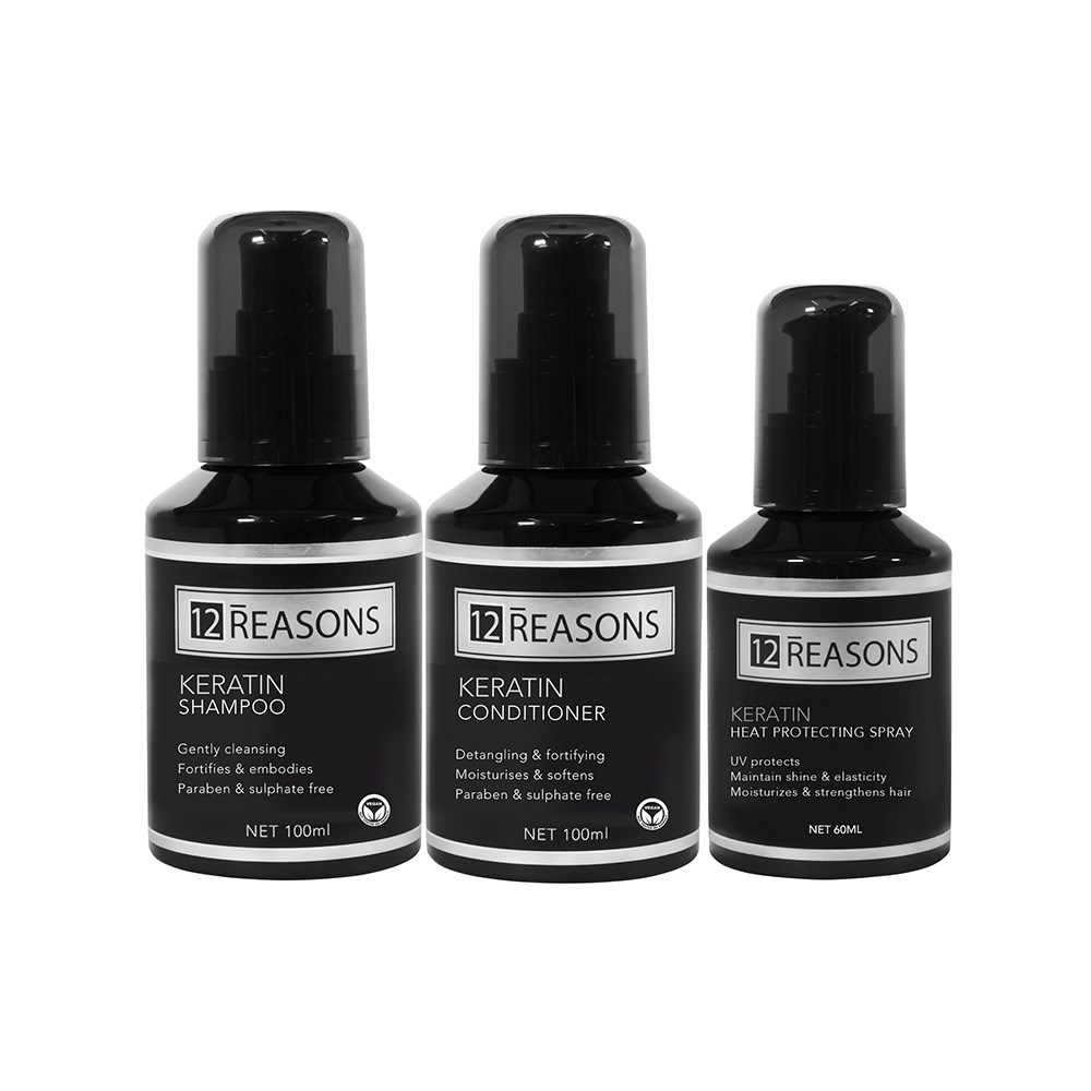 Love travel with 12Reasons! 12Reasons Keratin Travel Pack makes travel beautiful with three travel-sized products. Restore strength and shine while adding softness. Hair is left fortified and repaired. Dry, damaged hair is transformed, shining with nourishment. Enriched with keratin, macadamia oil and avocado oil for the best of nature. Free from parabens and sulphates. Colour-safe. Vegan. Not tested on animals. Designed and formulated in Australia.