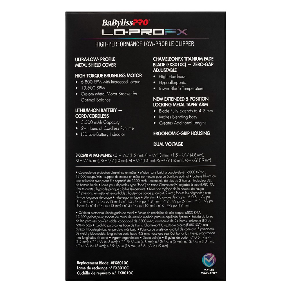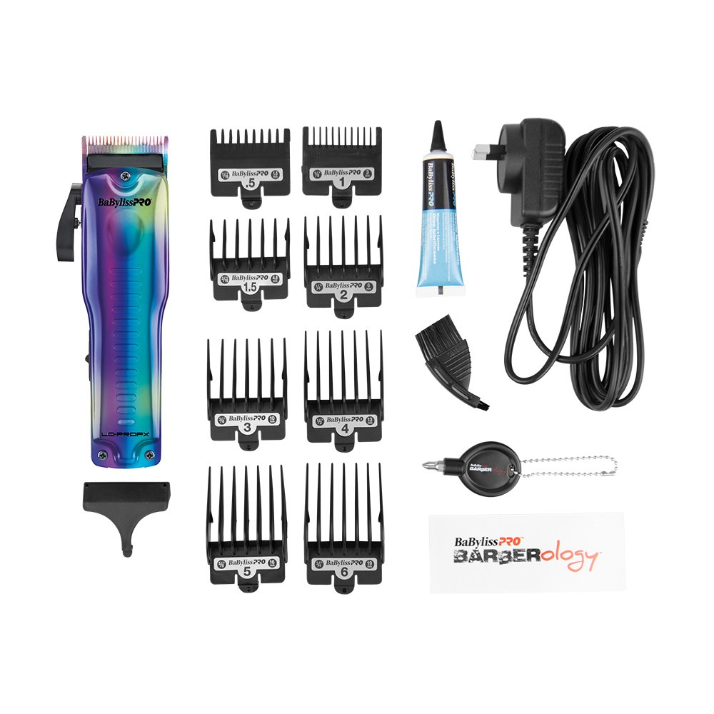 Give your tools a glow up! Limited edition BaBylissPRO LoPROFX Hair Clipper Chameleon is iridescent excellence. Ultra-low profile with ergonomic grip housing, LoPROFX Hair Clipper is BaByliss PRO’s most intuitive tool. This is incredible power, performance and, most importantly, feel. Powered by a high torque 6,800 rpm brushless motor and 3,300 mAh lithium ion battery with 2+ hours of cordless runtime. Zero gap, graphite wedge blade is low temperature, low friction and extremely durable. Great for removing bulk and creating the smoothest of fades. A perfectly balanced clipper with an emphasis on all-day comfort, feel and cutting performance.