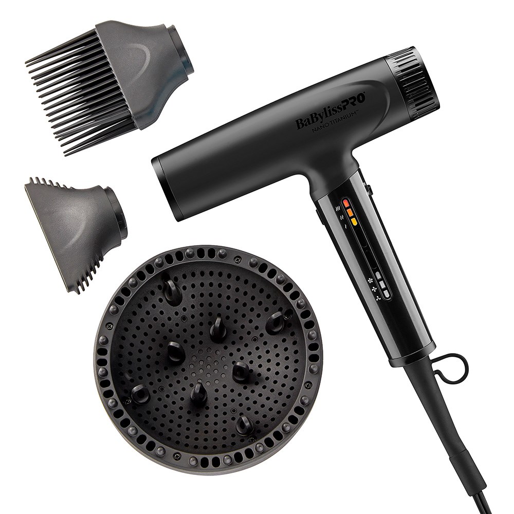 Good things truly do come in small packages! BaBylissPRO Nano Titanium Light Iconic Hair Dryer Black is compact, super-lightweight and high speed. Engineered airflow for faster drying. Ideally balanced T-shaped design weighs less than 453g and is almost the size of a smartphone. 1,400 watts of power and 9 digital heat/speed settings for versatile styling. Nano Titanium and ionic technologies deliver maximum smoothness and shine. Dual voltage for worldwide usage. Three innovative attachments meet every styling demand: cool-to-touch concentrator nozzle with air gaps for faster cooling, contoured diffuser and straightening comb with curved teeth for superior tension during styling.