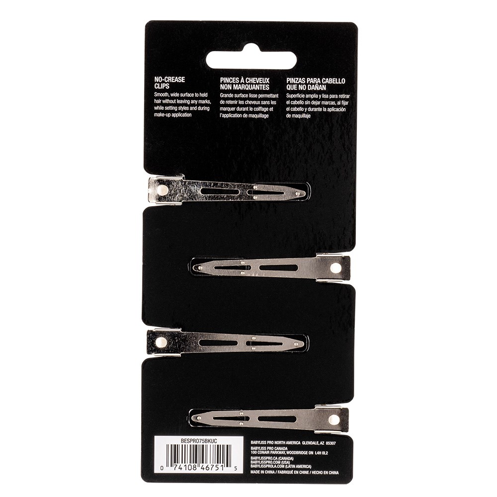 No creases, no worries! BaBylissPRO No Crease Hair Clips feature smooth, wide surfaces to hold hair without leaving any marks. Great for all hair types, these clips are ideal for creating pin curls, finger waves and setting updos. Also perfect for holding hair away from the face during makeup application. Four clips per pack.