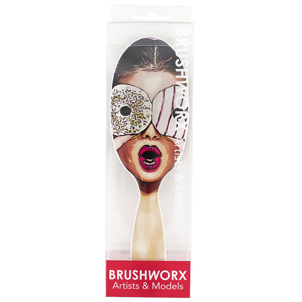 Brushworx Artists and Models Hair Brush Collection, this imaginative and unique design series elevates the simple cushion brush into a work of art! Utilising porcupine bristle (nylon and boar bristle) and a soft cushion base, Sugar Baby creates soft, silky hair with incredible shine and lustre. Perfect for detangling, blow-drying hair smooth, finishing updos, distributing styling product and brushing out heat styled curls. Brushworx Artists and Models, where brushes become an imaginative subject of desire.