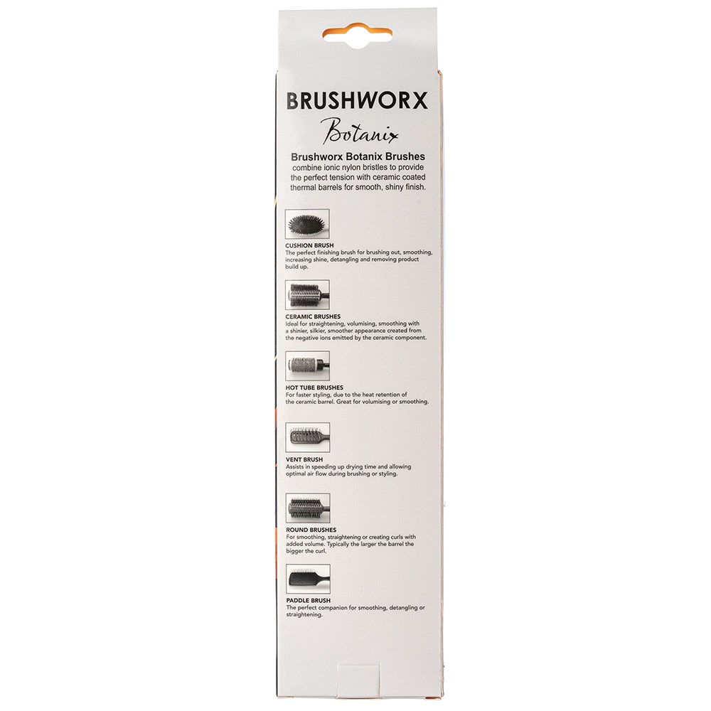 The ionic and ergonomic companion to every blow-dry. Brushworx Botanix Radial Hair Brush is an ionic ceramic styling brush with the perfect blend of nylon and boar bristles. Amp up shine and silkiness with the advantage of negative ions emitted by ceramic. Fantastic for smoothing, adding luscious volume or a wavy finish, this brush is part of a range of radial styling brushes designed to ensure all your styling needs are effortlessly met. An ergonomic handle allows for the most comfortable grip. Bonus: the pick handle shape makes for easy peasy sectioning.