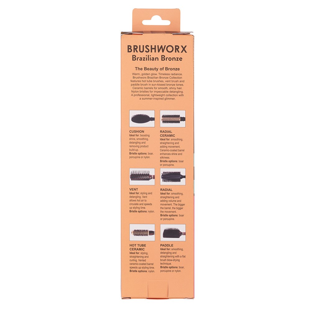 A glamorous brush for every occasion, every hairstyle and every hair type. The Brushworx Brazilian Bronze Vent Hair Brush combines flexible nylon bristles for smooth, detangled hair with vent hair brushes which allow heat to circulate for faster styling. The soft foam handle maximises comfort and control. Brushworx has your styling needs covered.