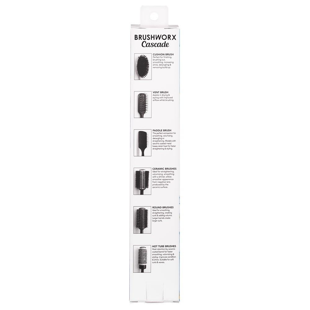 A hairstylist’s favourite brush! Brushworx Cascade Hot Tube Hair Brush Small takes the salon essential and makes it even better. More comfortable, more lightweight and more balanced. A texturised, rubberised handle improves grip and control. Nylon bristles create the perfect amount of tension for styling. Speed up your blow-drying time with the hollow, vented ceramic coated barrel, leaving hair silkier, shinier and smoother. Brushworx is proudly Australian-owned.