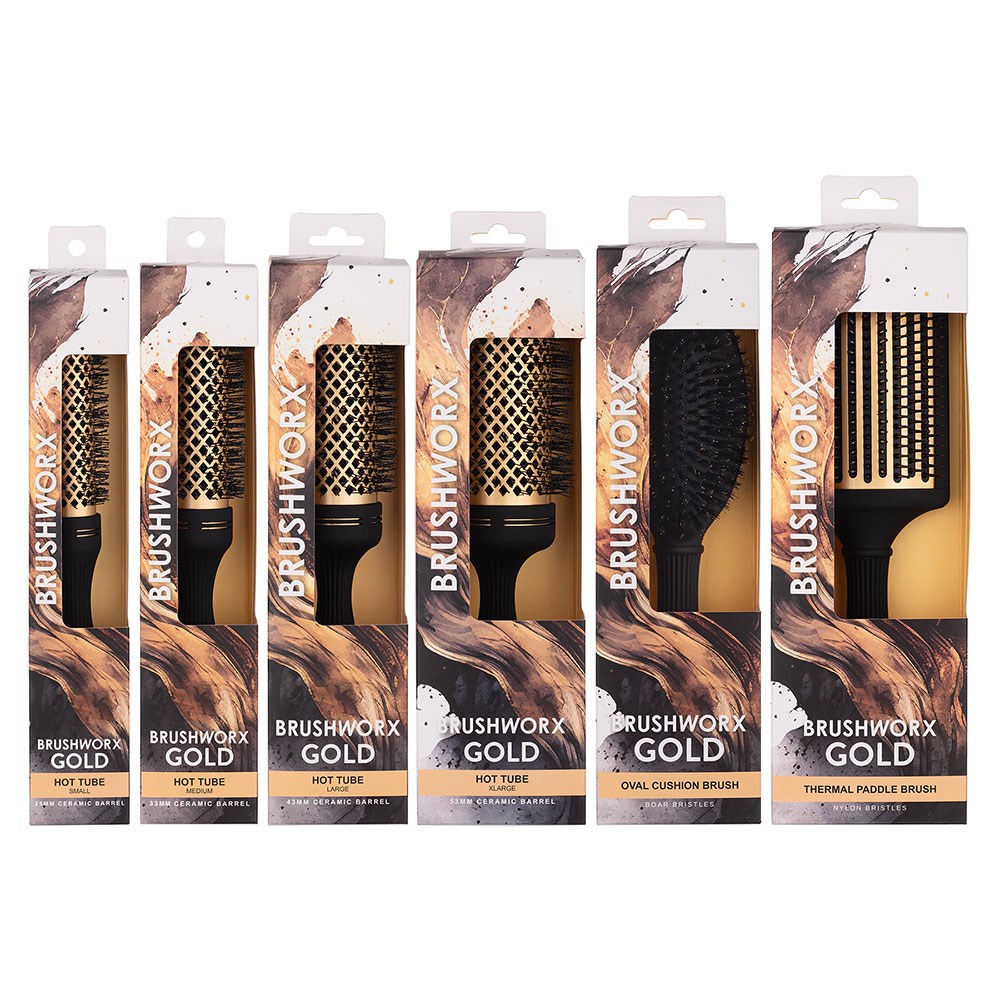 Brushworx Gold Ceramic Hot Tube Hair Brushes feature corrugated nylon bristles; a first for Brushworx! Tiny ripples allow the nylon bristles to grip and control the hair. Brushworx Gold Ceramic Hot Tube Brushes are ideal for thick, coarse, stubborn and hard to manage hair types. Brushworx Gold Ceramic Hot Tube Brushes also feature ceramic barrels to fight frizz for a smooth, shiny finish.