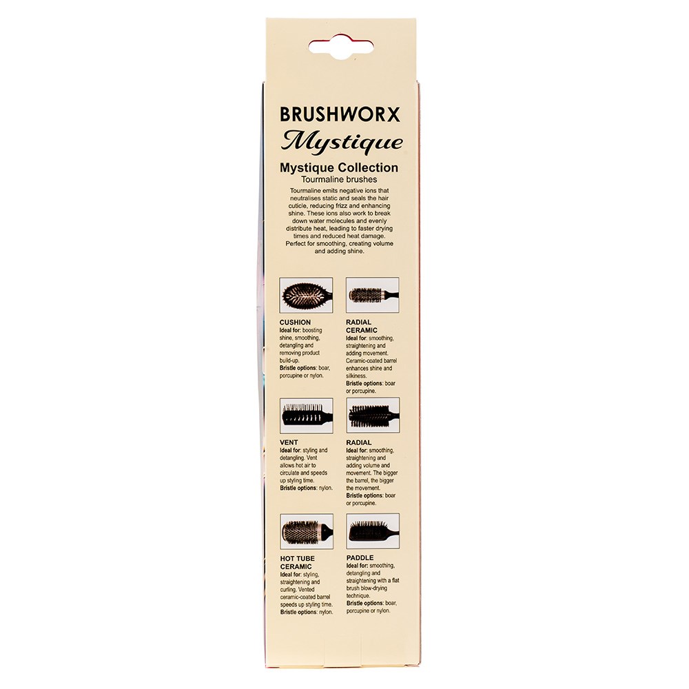 The power of tourmaline to effortlessly neutralise static, reduce frizz and enhance radiant shine. Brushworx Mystique Hot Tube Hair Brush Extra Large utilises tourmaline’s superior negative ion output for shinier, smoother and silkier styling. A stylist’s favourite, this hot tube brush accelerates your blow-dry, courtesy of the combination of hollow vented barrel and tourmaline helping to break down water molecules while evenly distributing heat. Best for all styles of blow-drying, particularly volume, waves and soft curls. Nylon bristles for perfect grip and tension. Rubberised handle for comfortable, non-slip hold. From Brushworx, the 100% Australian-owned brush authority.