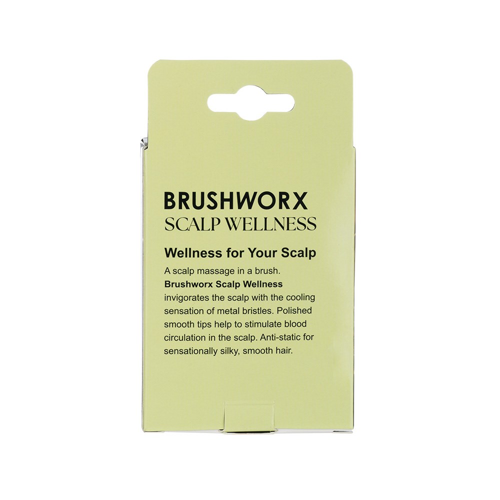 A scalp massage in a brush. Brushworx Scalp Wellness Anti-Static Detangler invigorates the scalp with the cooling sensation of metal bristles. This uniquely shaped brush is designed to fit in the palm of your hand. Excellent for detangling. Polished smooth tips help to stimulate blood circulation in the scalp. Anti-static for sensationally silky, smooth hair. Gently exfoliates the scalp without abrasiveness - great for keeping the scalp flake-free.