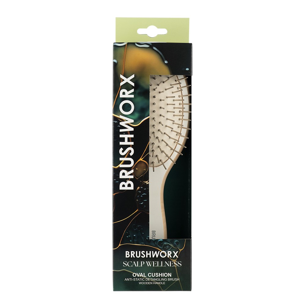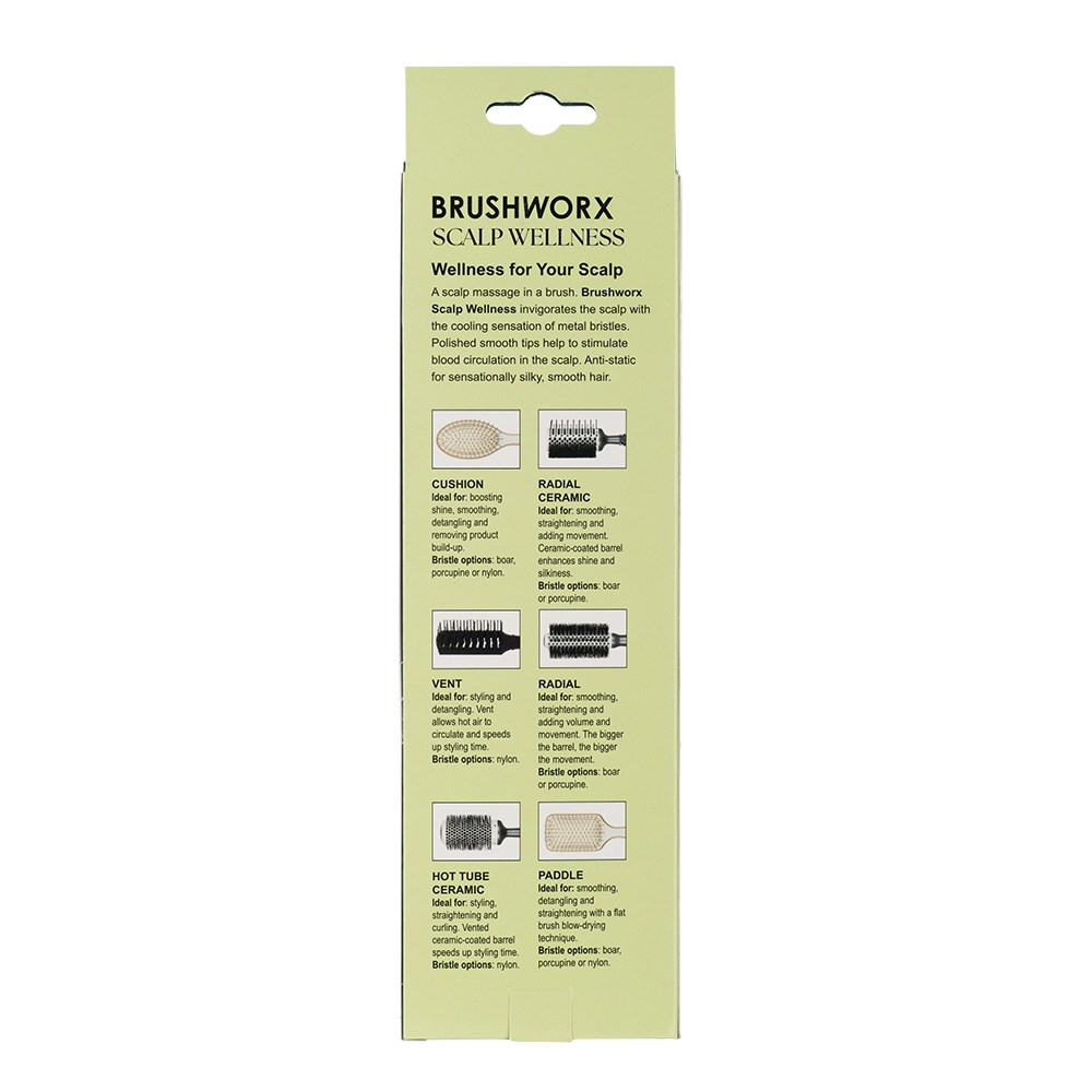 A scalp massage in a brush. Brushworx Scalp Wellness Cushion Brush invigorates the scalp with the cooling sensation of metal bristles. This oval cushion brush with wooden handle is excellent for detangling, enhancing shine and removing product buildup. Polished smooth tips help to stimulate blood circulation in the scalp. Anti-static for sensationally silky, smooth hair. Gently exfoliates the scalp without abrasiveness - great for keeping the scalp flake-free.