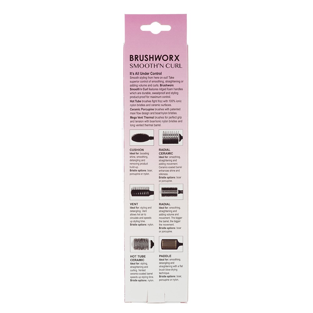 It’s smooth styling from here! Take control of smoothing, straightening or adding volume and curls. Brushworx Smooth’n Curl Hot Tube Brushes feature ridged foam handles which are durable, sweatproof and styling product-proof for maximum control. These hot tube brushes fight frizz with ionic, heatproof 100% nylon bristles and ceramic surfaces. Ionic bristles emit negative ions which help neutralise static electricity, taming frizz and flyaways for a sleeker finish. Vented ceramic-coated barrel speeds up styling time. From Brushworx, the 100% Australian-owned brush authority.