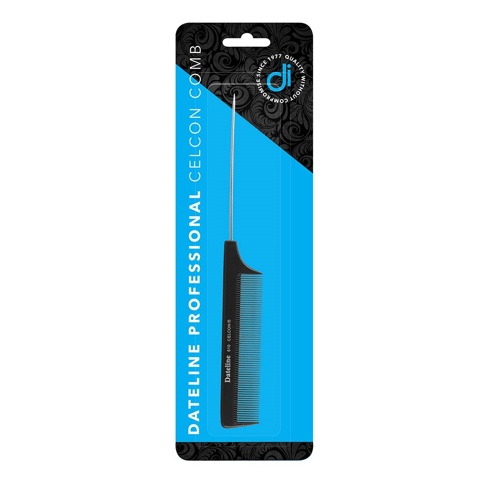 Quality without compromise since 1977. Dateline Professional Black Celcon 510 Metal Tail Comb is strong, flexible and unconditionally guaranteed against breakage*. With super-smooth teeth which effortlessly glide through all hair types, this comb is the perfect professional companion. Ideal for use with chemicals. Heat resistant and suitable for blow-drying. Ideal for close scalp foiling, perfecting updos and sectioning hair for all things colouring, cutting and styling. Designed by professional stylists and used worldwide.