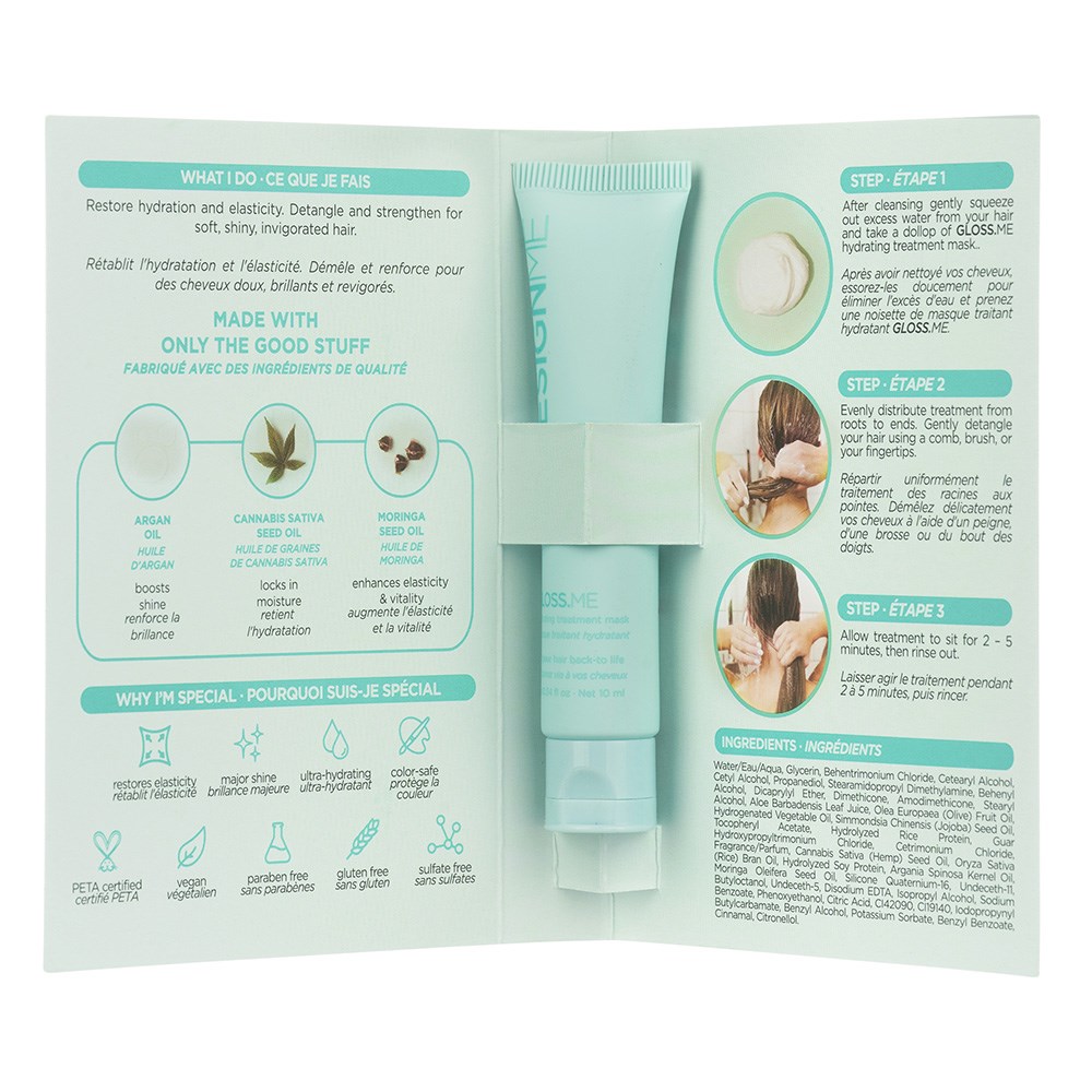 A deeply hydrating and strengthening hair mask which delivers smoother, shinier strands in just 5 minutes. DESIGNME Gloss.ME Hydrating Hair Treatment is infused with nourishing plant oils to instantly restore hydration, add shine and improve elasticity. Ideal for all hair types, particularly dry, damaged or frizz-prone hair. A silkier, stronger mane awaits! 10ml trial size, ideal for travel or on-the-go.