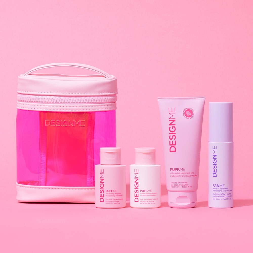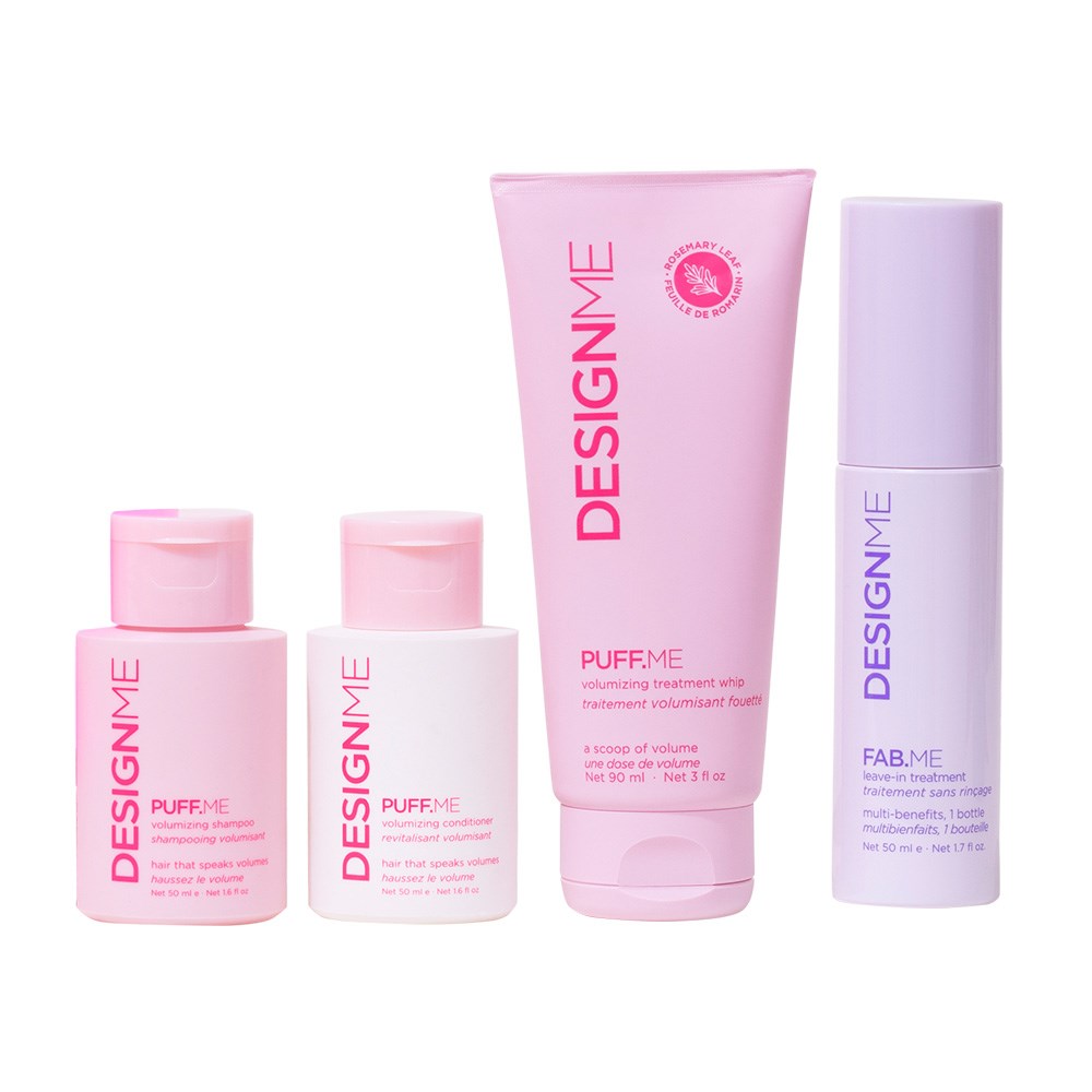 Plump up the volume with this powerhouse kit for weightless volume, body and fullness. DESIGNME Puff.ME Volume Minis Kit includes mini shampoo, conditioner, treatment whip and multi purpose lotion to create the perfect routine for fuller, thicker strands which look and feel amazing. Lightweight formulas ideal for fine and thin hair. Ideal gift, travel or trial set without committing to full size. 100% vegan, cruelty-free, paraben-free, gluten-free and sulphate free. Limited edition. Made in Canada.