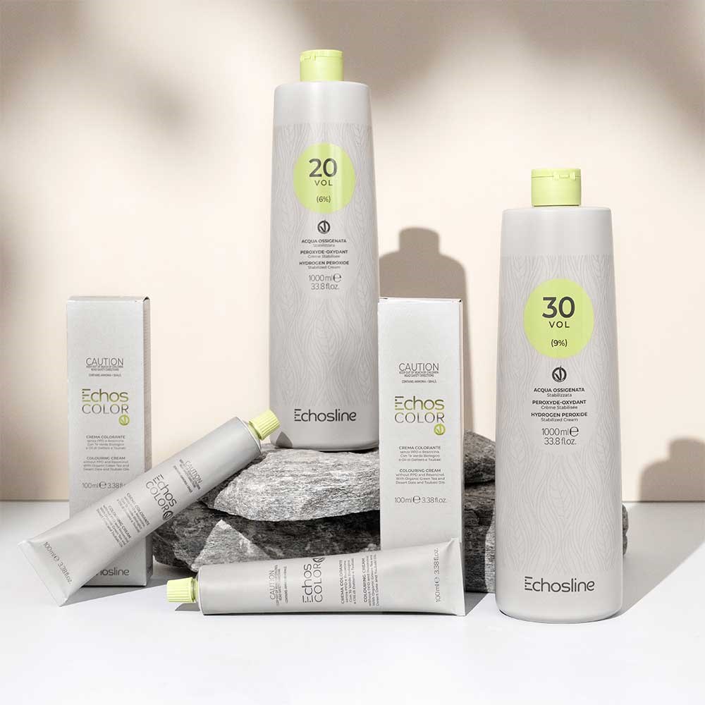 100% vegan, elite peroxide. Made in Italy, Echos Color Vegan 20 Volume Hair Peroxide is formulated to enhance the application of colour. This stabilised cream contains hydrogen peroxide 20 volume (6%). Designed for exceptional performance while maintaining the integrity of hair. Best used with the Echos Color Vegan range for even, consistent lift.