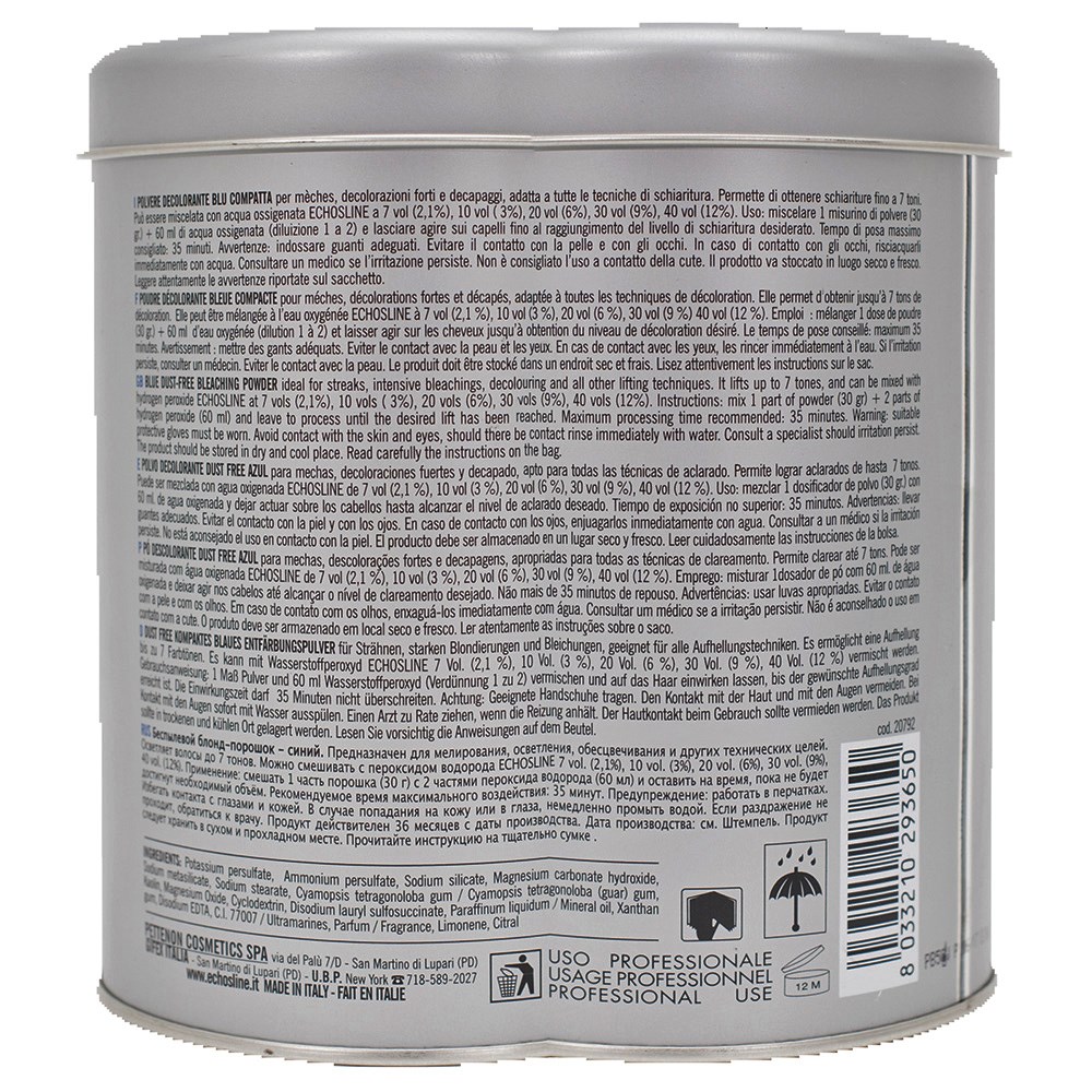 Made in Italy by Pettenon, Echos Color Dust Free Hair Bleach in Blue is ideal for streaks, bleaching and all decolouring and lifting techniques. Helps reduce unwanted yellow and orange tones, and lifts up to 6 tones. New non-volatile formulation reduces risks of irritation and sensitivity. To guarantee high colour stability and reduce the risk of unwanted colour changes we recommend the use of Echos Color Hair Peroxides
