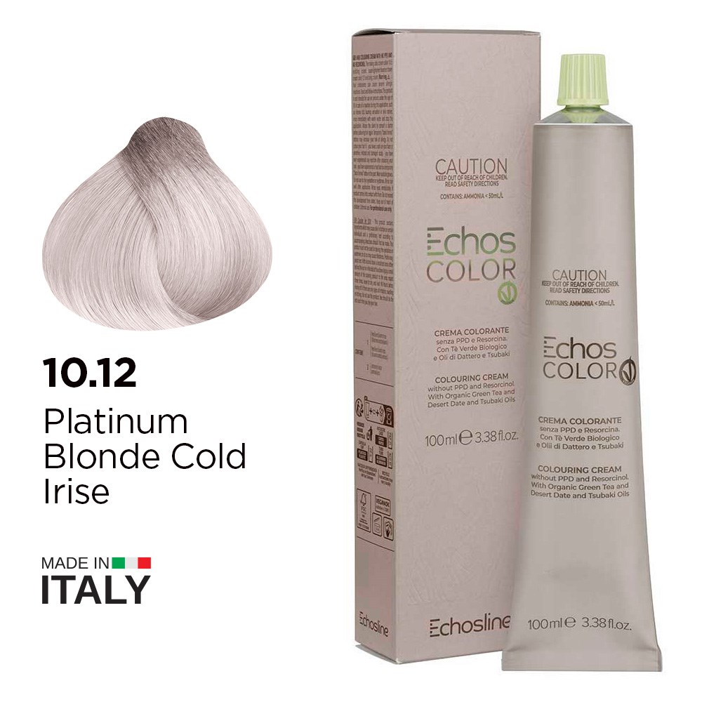 Incredible depth and longevity with reduced impact. Echos Color Vegan Hair Colour 10.12 Platinum Blonde Cold Irise respects professionals, consumers and the environment. This 100% vegan colouring cream is formulated without paraphenylenediamine (PPD) and resorcinol. Rich, long-lasting permanent hair colour boosted by green tea extract for longevity, desert date oil for revitalisation and Tsubaki oil for shine. Made in Italy, this is elite hair colour turned vegan.