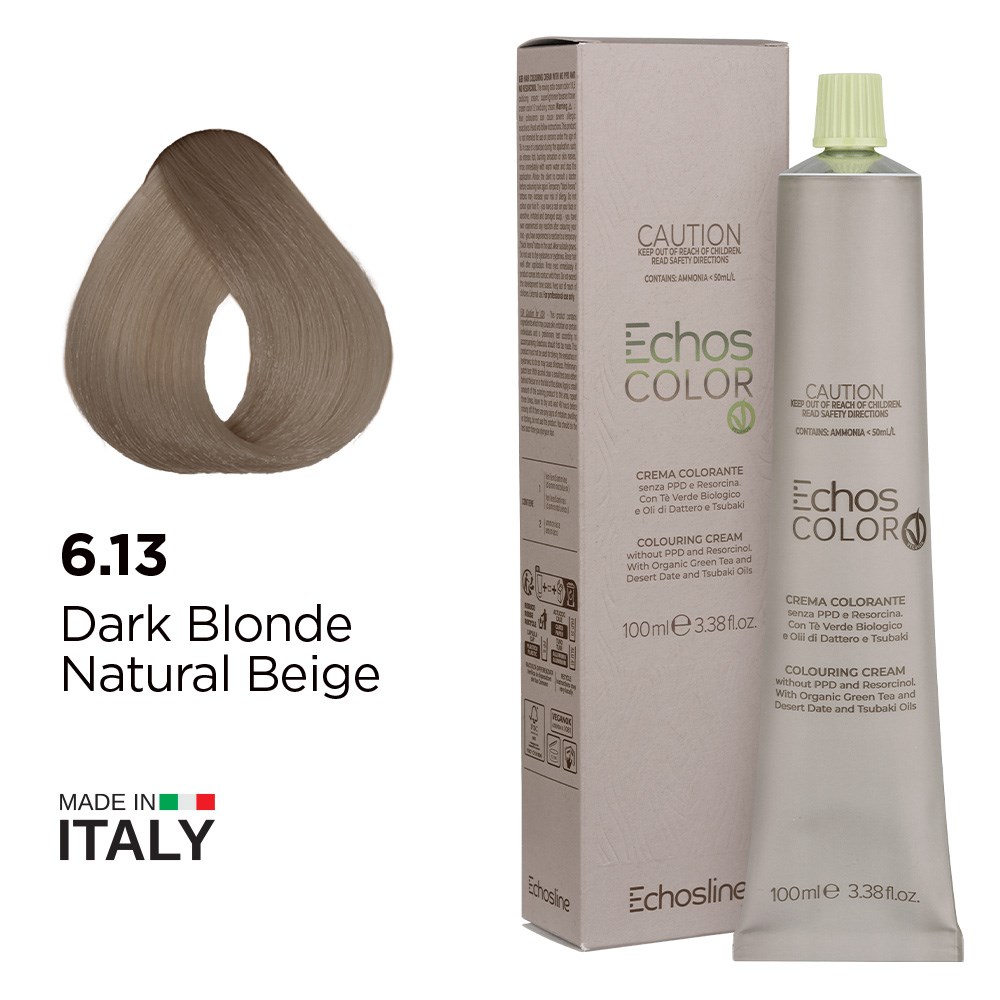 Incredible depth and longevity with reduced impact. Echos Color Vegan Hair Colour 6.13 Dark Blonde Natural Beige respects professionals, consumers and the environment. This 100% vegan colouring cream is formulated without paraphenylenediamine (PPD) and resorcinol. Rich, long-lasting permanent hair colour boosted by green tea extract for longevity, desert date oil for revitalisation and tsubaki oil for shine. Made in Italy, this is elite hair colour turned vegan.