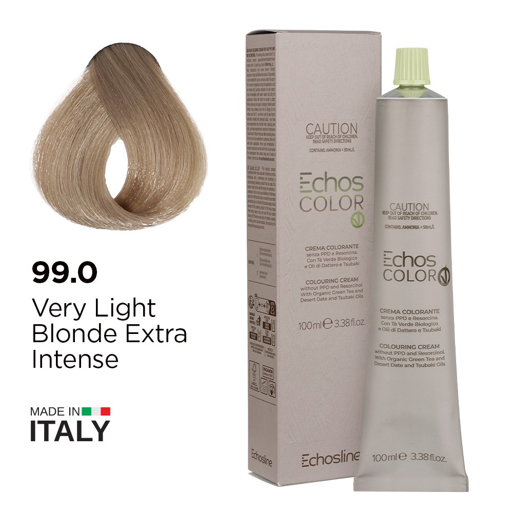 Incredible depth and longevity with reduced impact. Echos Color Vegan Hair Colour 99.0 Very Light Blonde Extra Intense respects professionals, consumers and the environment. This 100% vegan colouring cream is formulated without paraphenylenediamine (PPD) and resorcinol. Rich, long-lasting permanent hair colour boosted by green tea extract for longevity, desert date oil for revitalisation and Tsubaki oil for shine. Made in Italy, this is elite hair colour turned vegan.