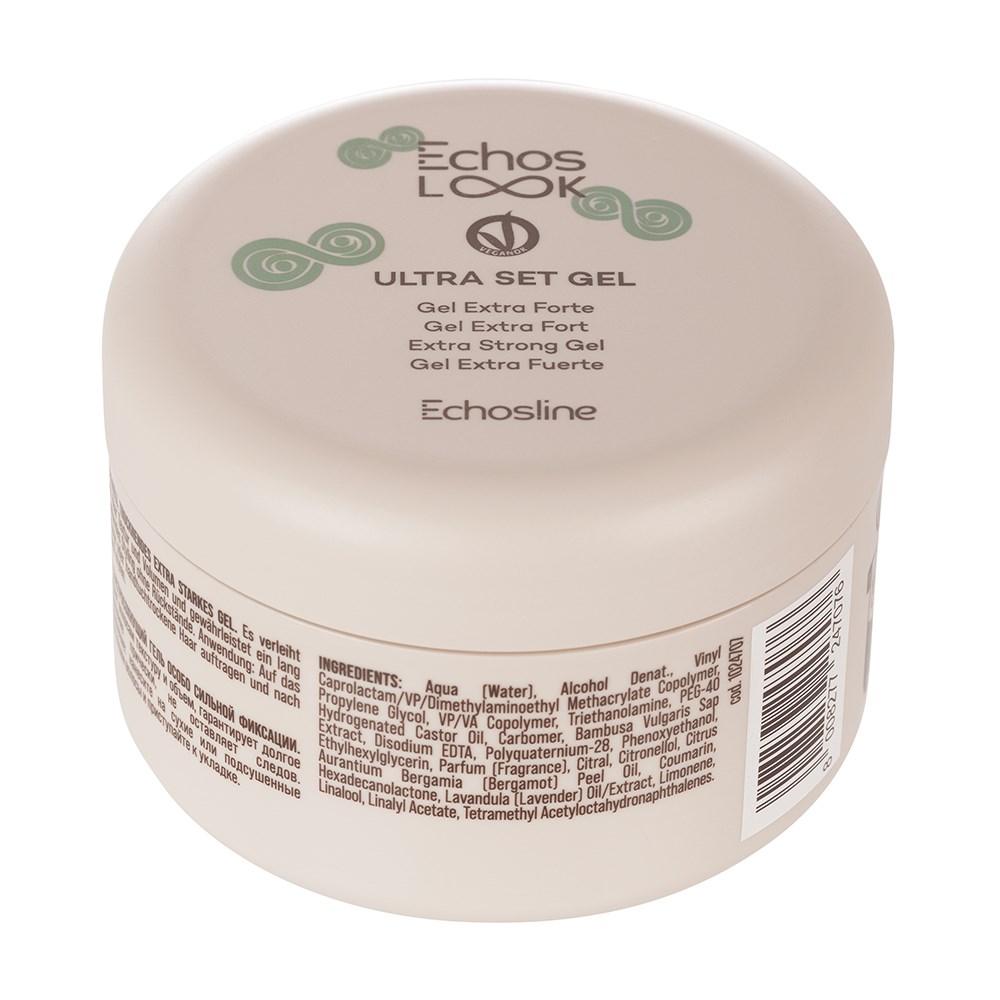 Infinite possibilities. Echos Look was created to enable endless ways to express our individuality. Echos Look Ultra Set Gel is high-performance, forward-looking and 100% vegan. This quick drying, extra-strong hair gel adds texture and volume to the hair. Long-lasting styling without any residue. Bamboo extract and pisum sativum strengthen, hydrate and soothe strands.