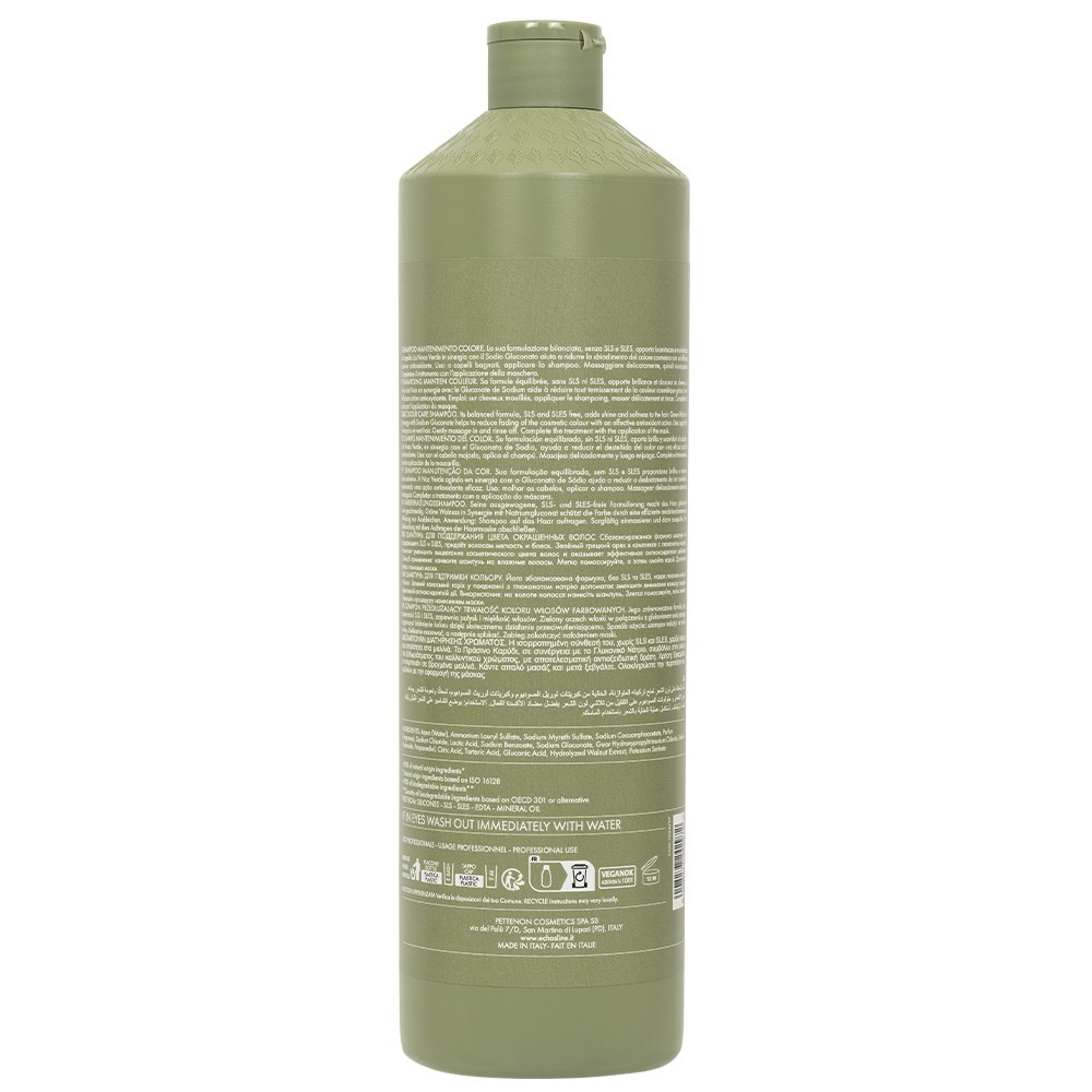 Protect colour, the smart vegan way. Echosline Colour Protection Complex System is powered by green walnut and sodium gluconate to defend against colour fade while improving hair’s structural integrity. Echosline Colour Care Shampoo 1L gently cleanses, adds shine and softness to hair and maintains hair’s vibrancy. Hair and scalp are left rebalanced. Ideal for frequent use. >95% ingredients of natural origin*. >90% biodegradable ingredients**. Formulated without silicones, Sodium Lauryl Sulphate (SLS) and Sodium Lauryl Ether Sulphate (SLES).