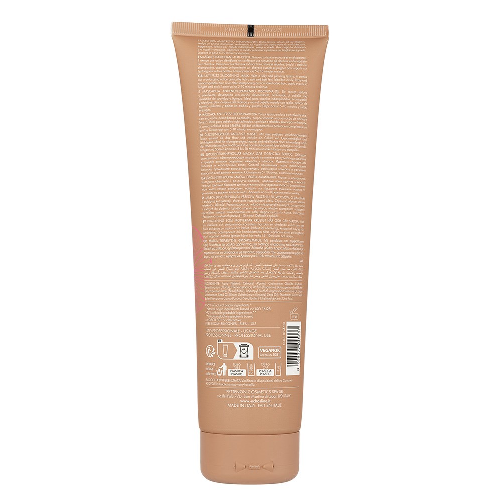 The ideal anti-frizz mask. Echosline Discipline Smoothing Mask is a smoothing mask which eliminates frizz. Designed for unruly, frizzy and rebellious hair, this 100% vegan mask is pH balanced and harnesses the smoothing power of linseed oil, argan oil and cocoa butter. Frizz is eliminated while softness and shine is renewed. >95% ingredients of natural origin*. >95% biodegradable ingredients**. Free from silicones, Sodium Lauryl Sulphate (SLS) and Sodium Lauryl Ether Sulphate (SLES).