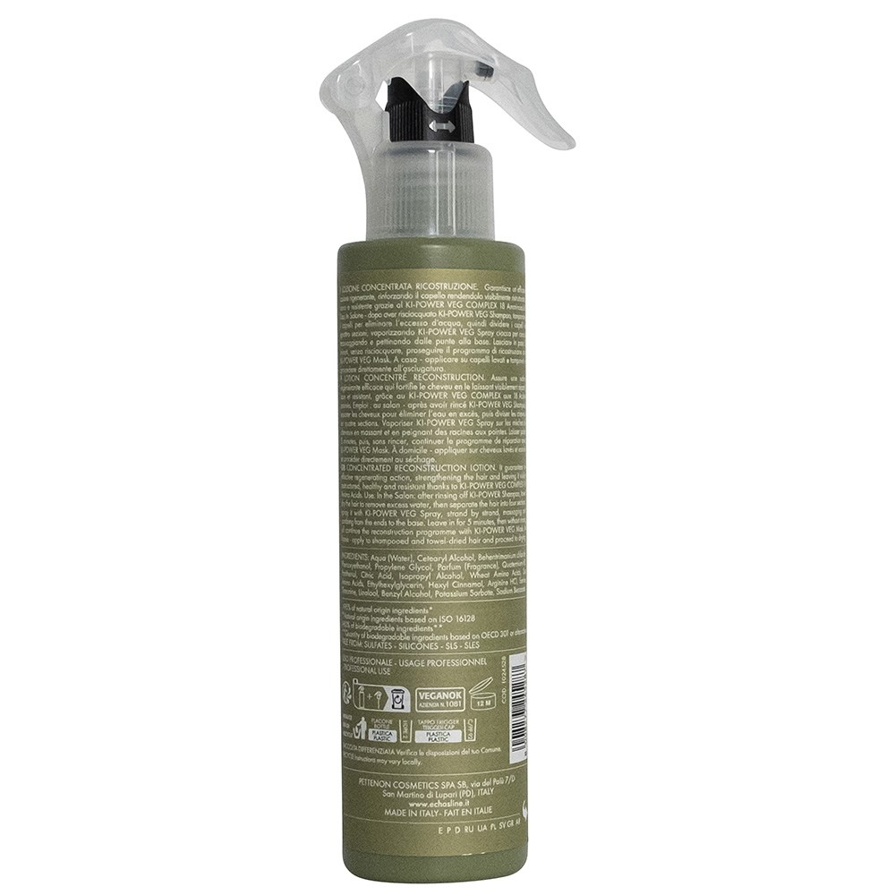 Colouring, lightening, blow-drying and styling all take a toll on hair. Renew hair’s structure with Echosline Ki-Power Veg Complex, a potent blend of amino acids which repairs and regenerates. Echosline Ki-Power Veg Spray is a concentrated reconstruction lotion hair treatment which leaves hair resilient and strengthened. Powered by Ki-Power Veg Complex with 18 amino acids, vegetable keratin and pea, soy and wheat extracts, this 100% vegan spray contains >95% ingredients of natural origin* and >80% biodegradable ingredients**. Free from silicones, Sodium Lauryl Sulphate (SLS) and Sodium Lauryl Ether Sulphate (SLES).