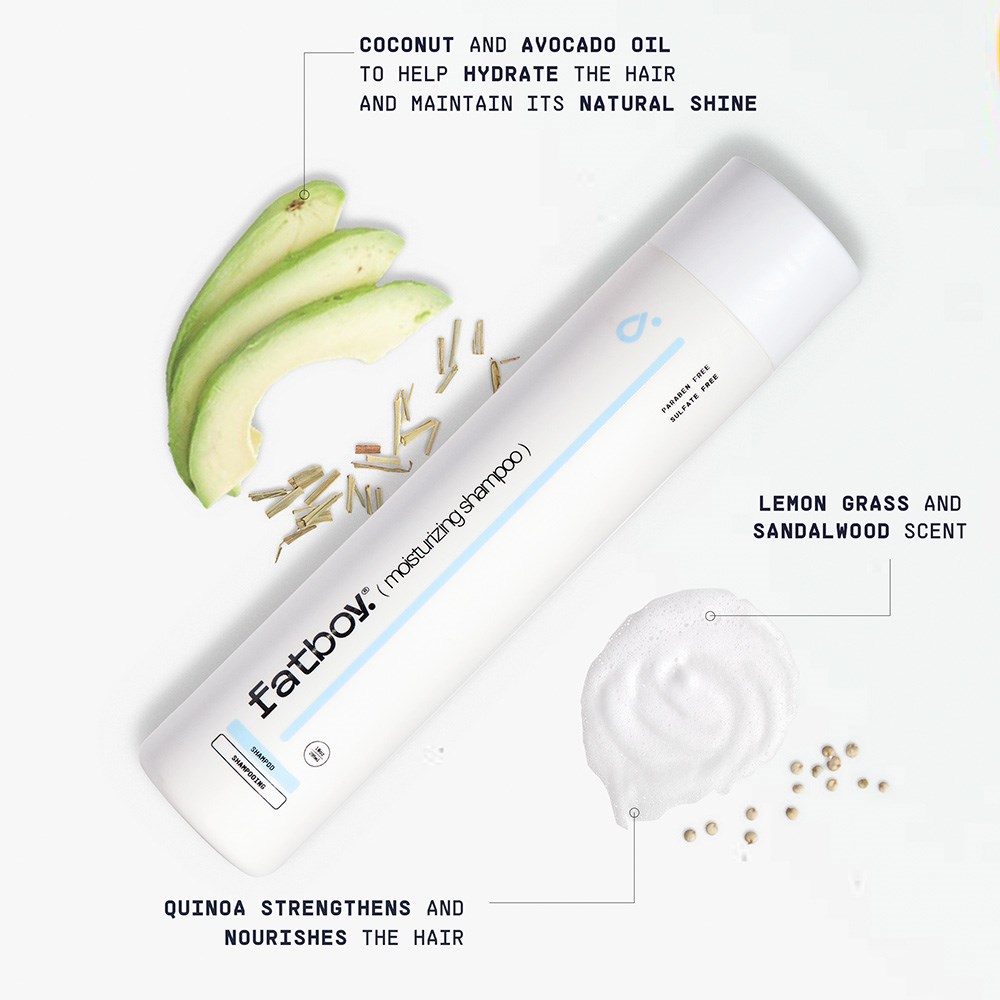 Fatboy Moisturising Shampoo is a carefully crafted blend of select ingredients. Quinoa and its nine essential amino acids strengthen hair by nourishing and hydrating. The addition of coconut oil and avocado oil help to hydrate and maintain hair’s own beauty. Hair shines with every use. Paraben-free, sulphate-free and cruelty-free. Get ready to top the charts with stylist-grounded, performance-driven Fatboy.