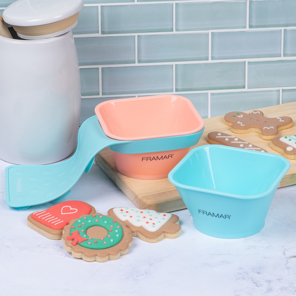 The days of messy toning are officially over! Framar Toning Tub Suction Cup Bowls 2 Pack Cookie Cutter is designed to attach directly to the shampoo basin, taking the mess out of toner applications. Apply toner just inches from the client’s head, saving waste, mess and time. Set includes one suction cup sleeve and two colour bowls. Sweet hues of Cookie Cutter.