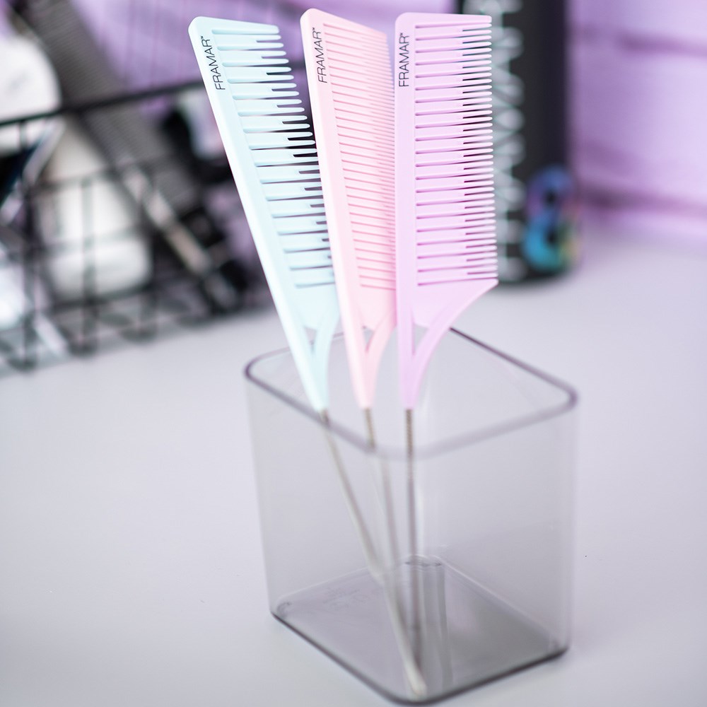 It’s not a dream, Framar Dreamweaver Highlighting Tail Combs 3pk Pastel are here! Intricately designed to save time behind the chair and shave hours off highlighting applications. The three combs easily separate hair into an even ‘weave’ (how a highlight would be traditionally sectioned). Lightweight, easy-to-use with a 12.7cm (5”) stainless steel tail for parting and sectioning hair. Three different sized weave combs to suit all services, from fine weaves to thicker highlights.