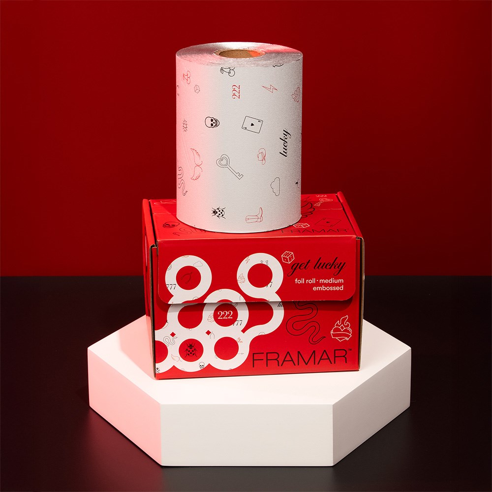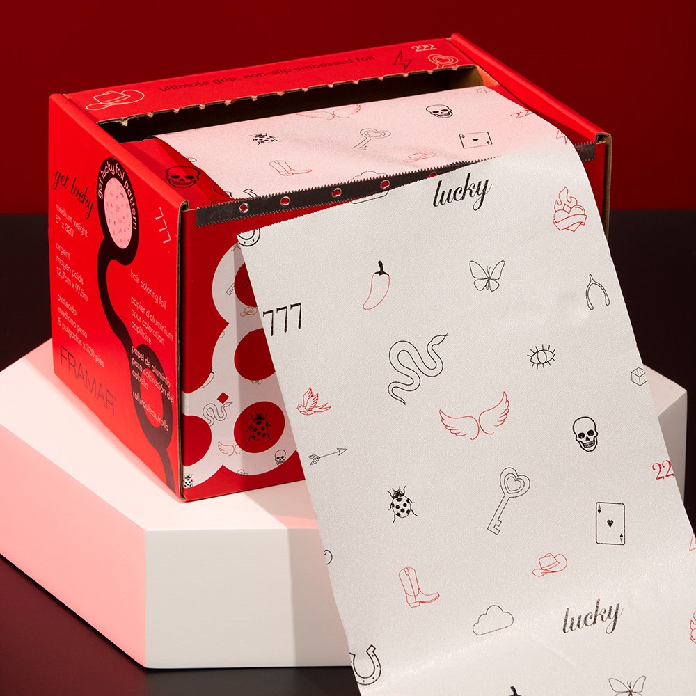 Feeling lucky? Framar Embossed Foil Roll in Get Lucky is the perfect non-slip grip embossed foil. The embossed texture prevents slippage so you can breeze through any colouring service. High quality foil in good luck charm print guaranteed to make every process more fun for you and your client. Rolls out easily with no-hassle cutting. Simply cut to your desired length with the inbuilt cutting blade in the dispenser box. Great for long hair and minimises waste.