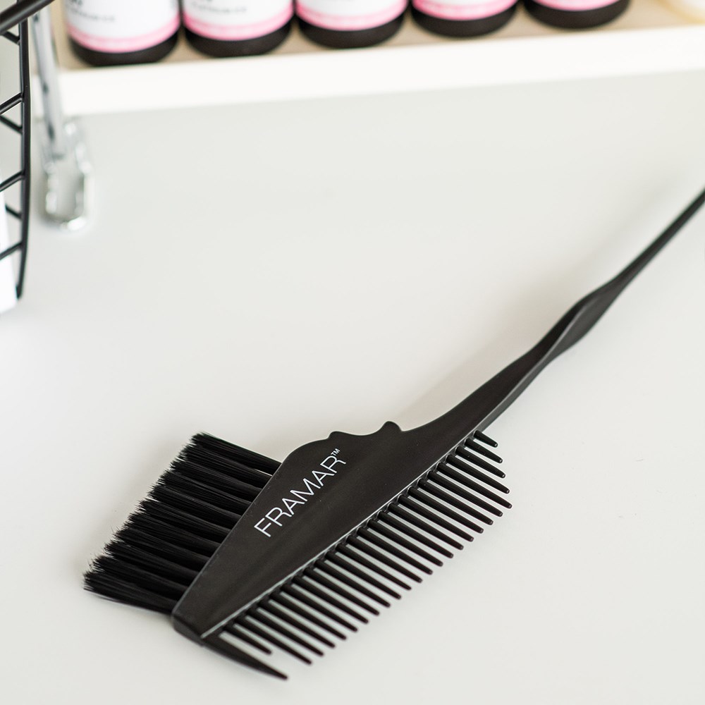 See you on the flip side! Framar Emperor Colour Tint Brush is a double-sided brush with bristles on one side and a comb on the other. Paint on colour and distribute it though hair using the comb in one quick flip of the brush. Tapered handle is ideal for sectioning hair during colour applications. Framar’s famous AccuSoft bristles are tapered to pick up and distribute colour to hair evenly, quickly and precisely.