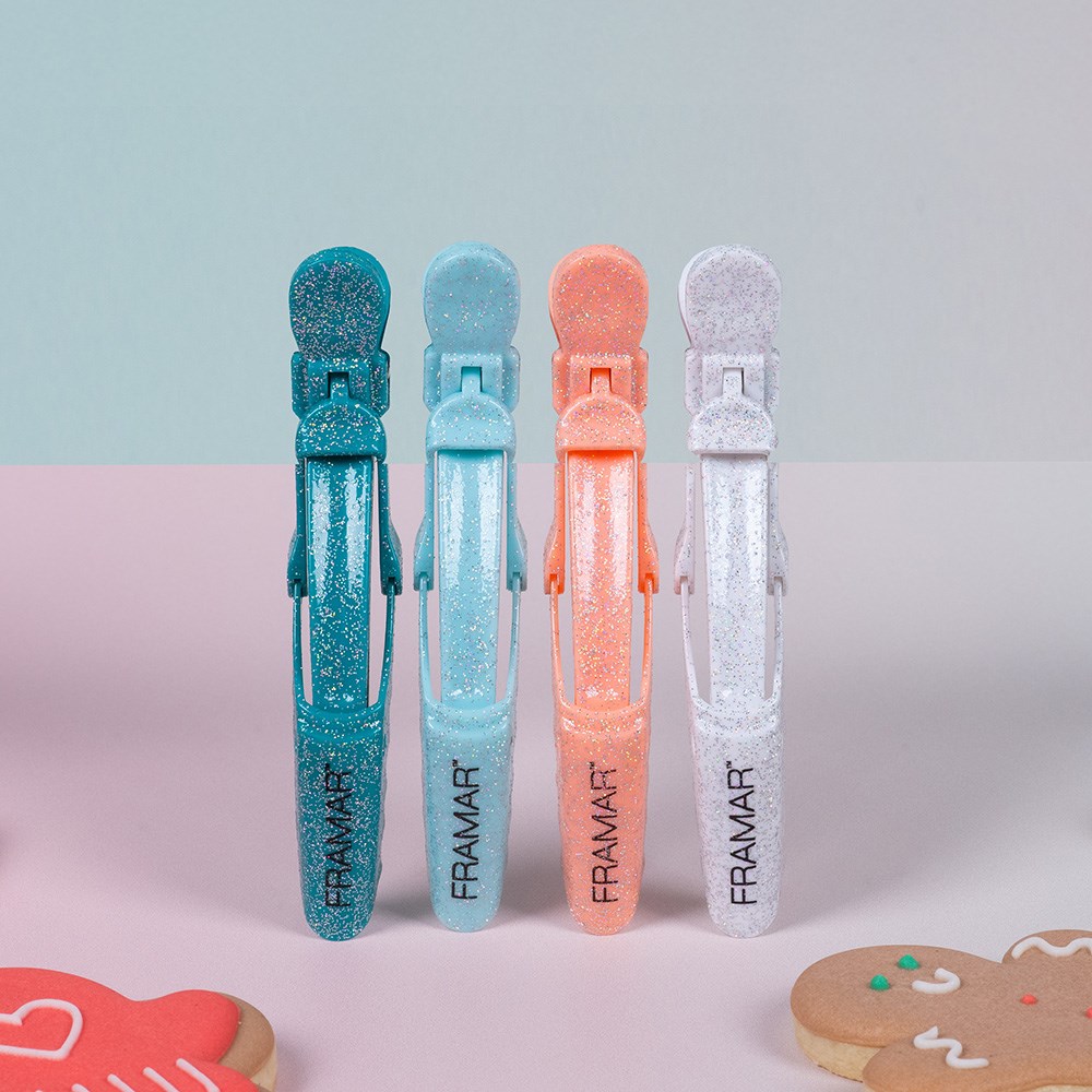 Bake this season bright! Embrace baked goodness with sweet hues. Framar Gator Grip Clips 4 Pack Cookie Cutter effortlessly hold large sections of hair. With a wide mouth and rubberised non-slip surface, these clips are stronger than an alligator. Secures hair during colouring, styling and foiling. Industrial springs for ultimate durability. Pack of four.