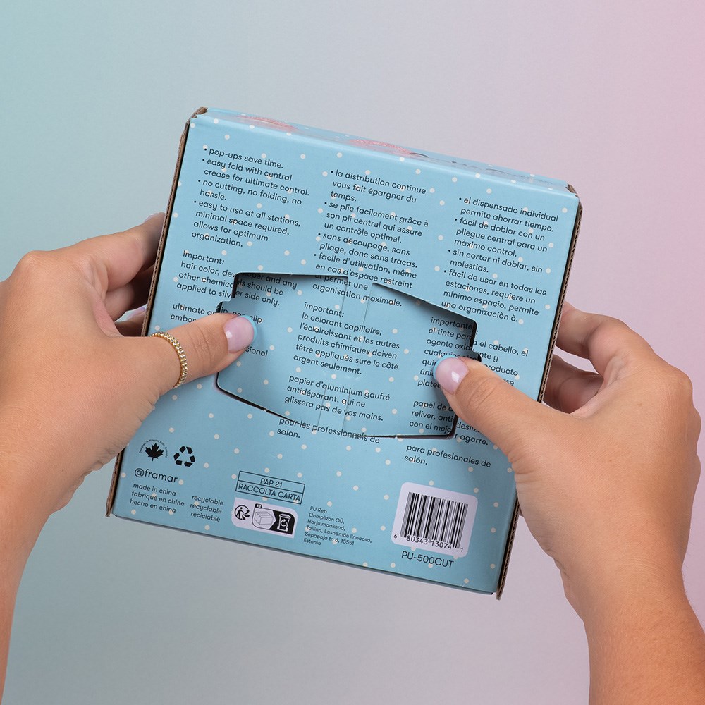 Bake this season bright! Framar Pop Up Foil Cookie Cutter pre-cut, pre-folded and ready when you are. The embossed texture prevents slippage so you can breeze through any colouring service. High quality hairdressing foil in an adorable baked goods print is guaranteed to make every process more fun for you and your client. Featuring the signature, perforated push up base, designed to keep foils extra perky for ultimate convenience. Includes 500 sheets with each sheet measuring 12.7cm x 27.94cm. Sprinkle your day with fun!