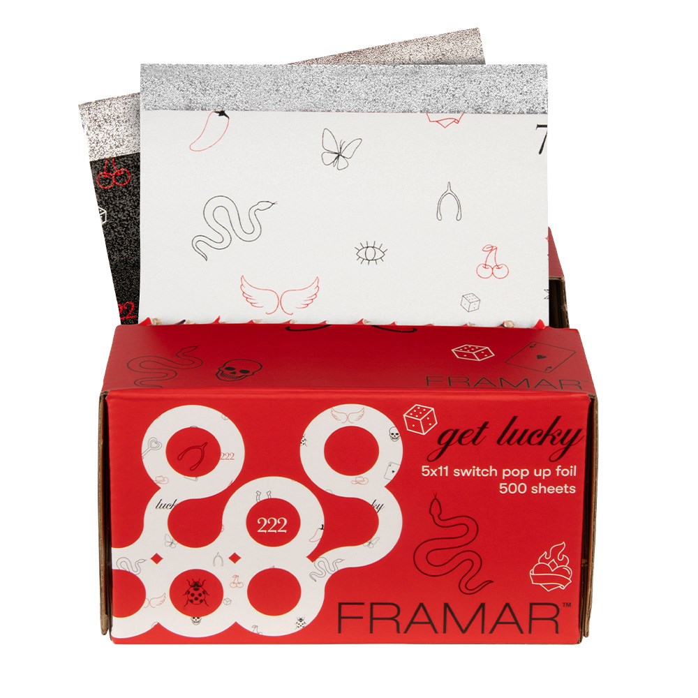 Lucky you, you just found your new good luck charm! Framar Pop Up Foil in Get Lucky is pre-cut, pre-folded and ready when you are. The embossed texture prevents slippage so you can breeze through any colouring service. High quality hairdressing foil in alternating sheets of black and white with good luck charms. Featuring the signature, perforated push up base, designed to keep foils extra perky for ultimate convenience. Includes 500 sheets with each sheet measuring 12.7cm x 27.94cm.