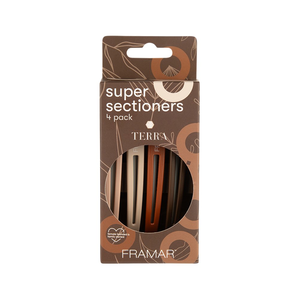 Effortlessly section hair without creasing or denting. Framar Super Sectioner Clips 4pk Terra Neutrals allow for seamless styling with every service. Strong but comfortable grip with cushion compression. Self-locking mechanism with silicone strip to keep hair in place without creasing. Chemical resistant material. Four pack in neutrals.