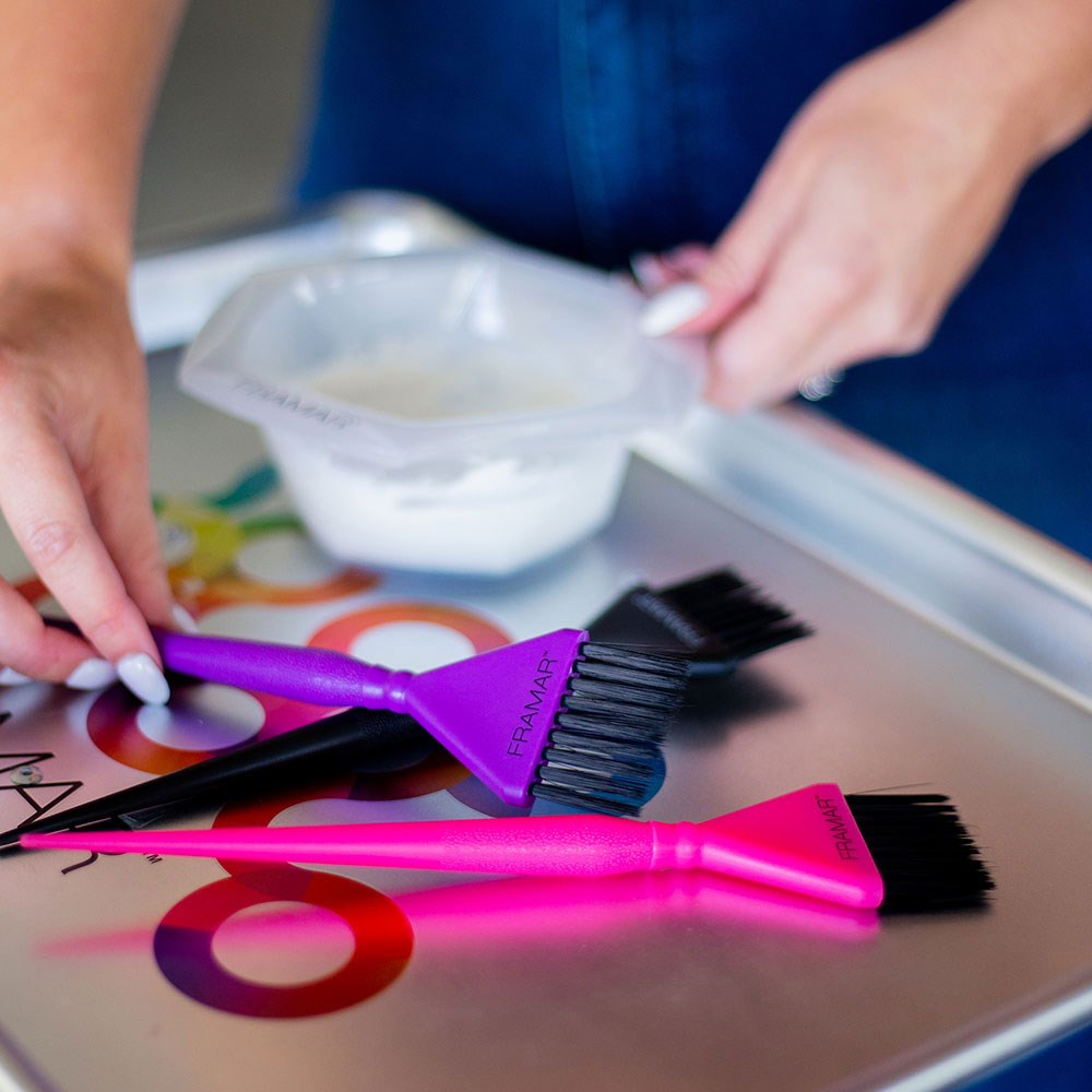 Nice and precise! Framar Triple Threat Tint Brush Set Coloured is a set of brushes which will bring out your true talent. These brushes tackle detail work with ease. Perfect for root tapping, precise blends and babylights. Framar’s famous AccuSoft bristles are tapered to pick up and distribute colour to hair evenly, quickly and precisely.
