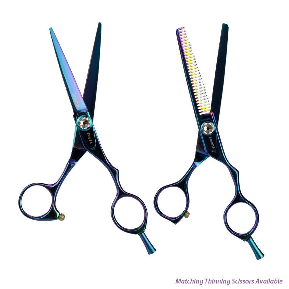 You’ll be the centre of attention with the Iceman Bling Chameleon 5.5" Scissors. Showy style meets traditional craftsmanship. This Iceman chameleon inspired finish transforms with striking colours of blue and purple.