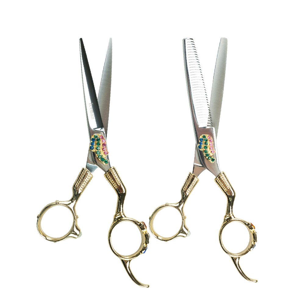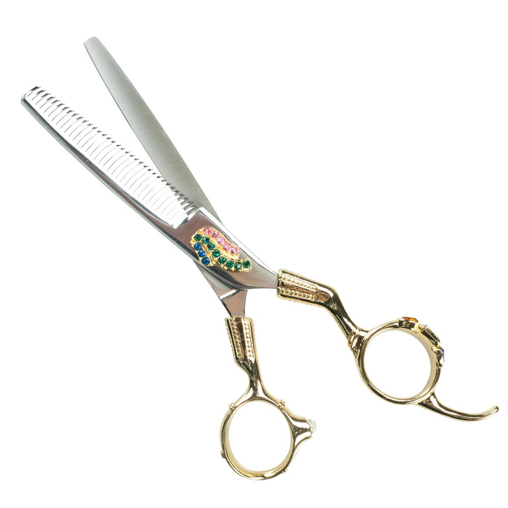 The Iceman K Sutra Gold series of scissors features gorgeous jewelled detailing on both the blades and the finger holes. Be glamorous and distinctive, while impeccable Iceman quality cuts hair with ease. Iceman made from stainless steel for maximum long-lasting sharpness. Perfect for thinning hair of any length. Also featuring offset handles and a fixed finger rest for comfort and control.
