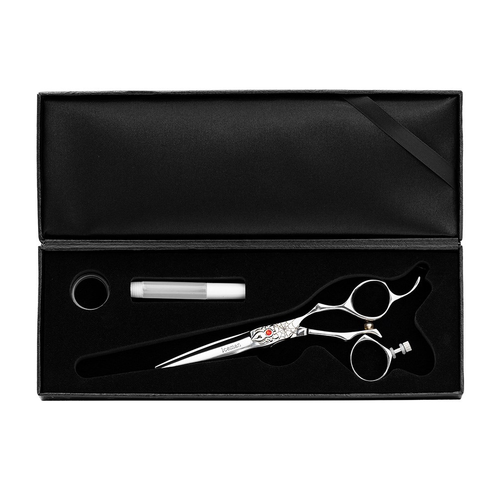 Featuring a ‘redback’ jewelled spider and black spider web design, Iceman Suntachi Black Widow Red Gem Swivel Thumb Hairdressing Scissors embody style and function. Iceman features a 360° rotating thumb which minimises hand and wrist strain by allowing your hand and shoulder to remain in a relaxed, natural position when cutting. Hand-honed, utilising high-density Japanese steel for a sharp, long-lasting edge. The 5.5” scissors are perfect for cutting, sliding, slicing, chipping and notching. Ideal for any length of hair, wet or dry. Exceptional scissors with exceptional good looks!