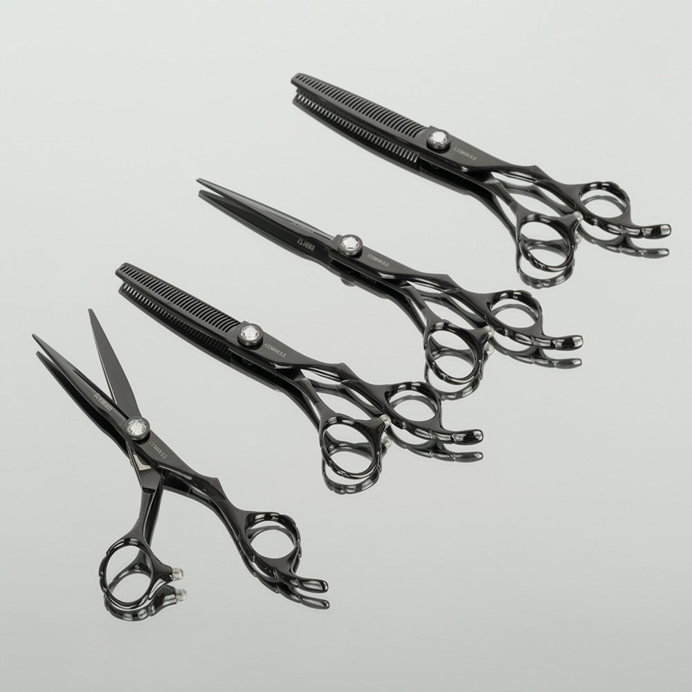 The best thinners to enhance your craft. Iceman Suntachi VG10 5.5” Hairdressing Thinner is crafted to precision. VG10 is a composite alloy consisting of cobalt and high carbon content. Cobalt enhances strength, robustness and durability, while high carbon content maintains sharpness for a long time. Less likely to dull, corrosion resistant with enduring sharpness makes these thinners perfect for the salon environment. Iceman Suntachi VG10 5.5” Hairdressing Thinners feature an offset handle for a more open, comfortable position. Cutaway thumb offers additional comfort. These black, scalloped thinners are best at blending and creating softer finishes. Suitable for all hair types. Adjustable, jewelled, raised tension dial. Includes lubricating oil and finger rest insert.