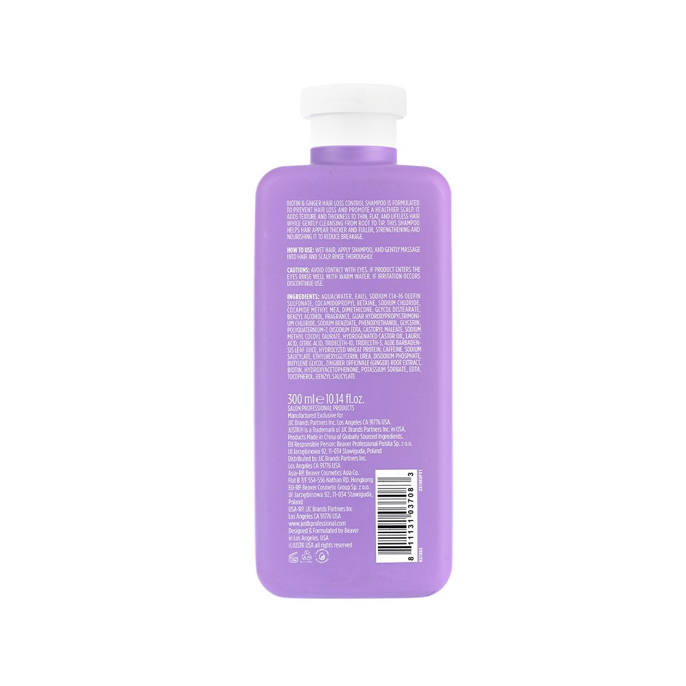 JustK is just results. From whoa to wow, one wash at a time. Salon-proven formulas which solve all the problems of the hair rainbow. Choose JustK Hair Loss Control Shampoo for strengthened hair which feels fuller and thicker. Infused with biotin and ginger, this sulphate-free, paraben-free shampoo adds texture and fullness to thin, flat and lifeless hair. Gently cleanse from root to tip while nourishing to help reduce breakage. Beautiful vitality becomes affordable!