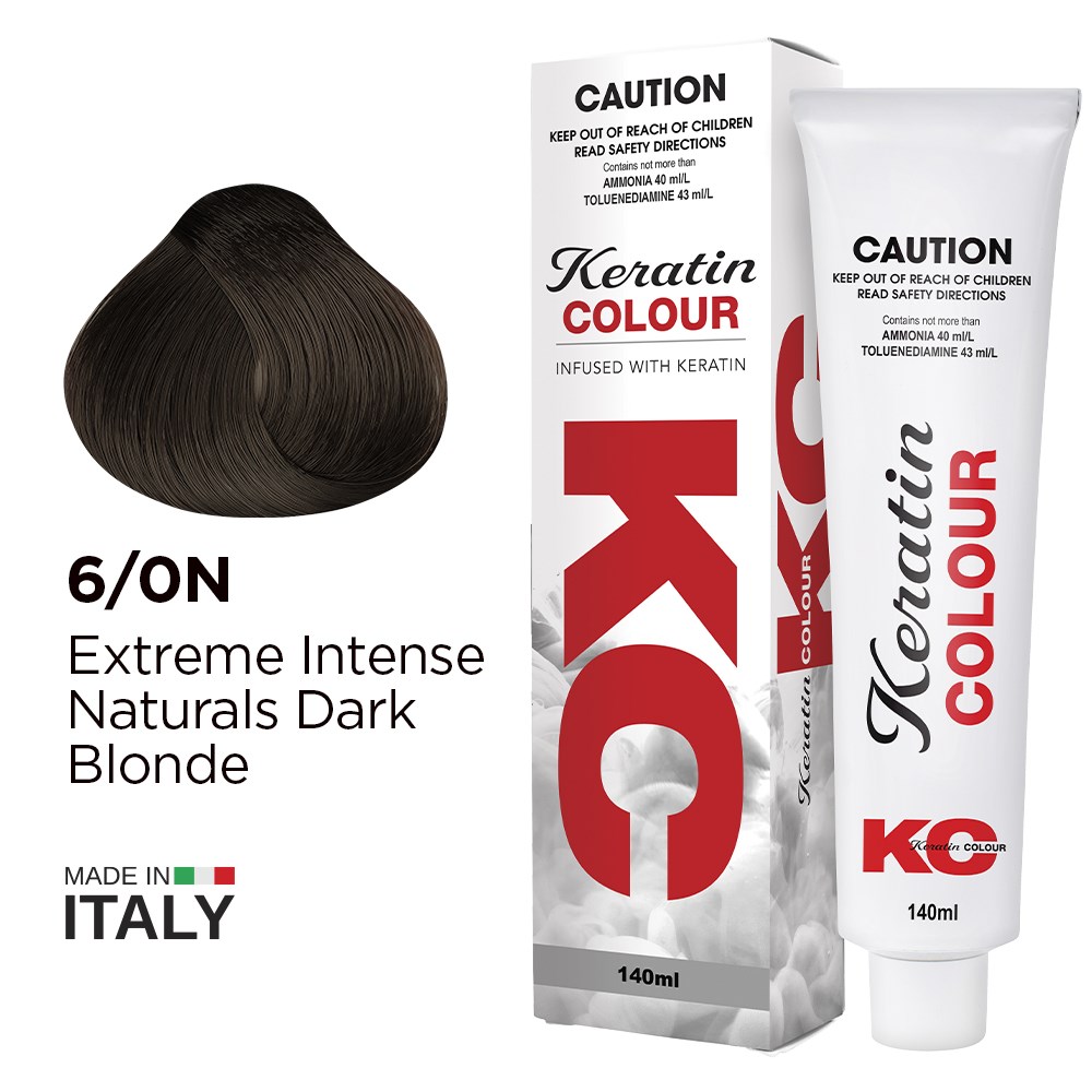 Keratin Colour is transformation. With new formula and new packaging, Keratin Colour Permanent Colour 6/0N Extreme Intense Naturals Dark Blonde delivers vivid, long-lasting hair colour while renewing hair from within. Enriched with advanced Keraveg, softening Tsubaki oil, refreshing lotus flower, glycolic extract and luminous diamond powder for sensationally fade-resistant colour. Full coverage, green-based colour range which neutralises warmth for balanced, natural-looking results. Exceptional value with supersized 140g tube and new whipped cream consistency which requires less product for complete hair colour service. Now 100% vegan and proudly Australian-owned.
