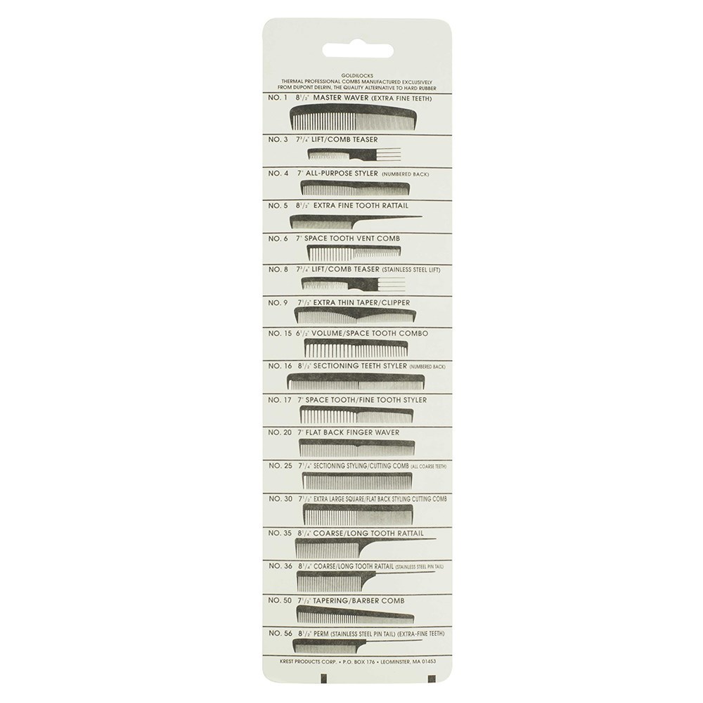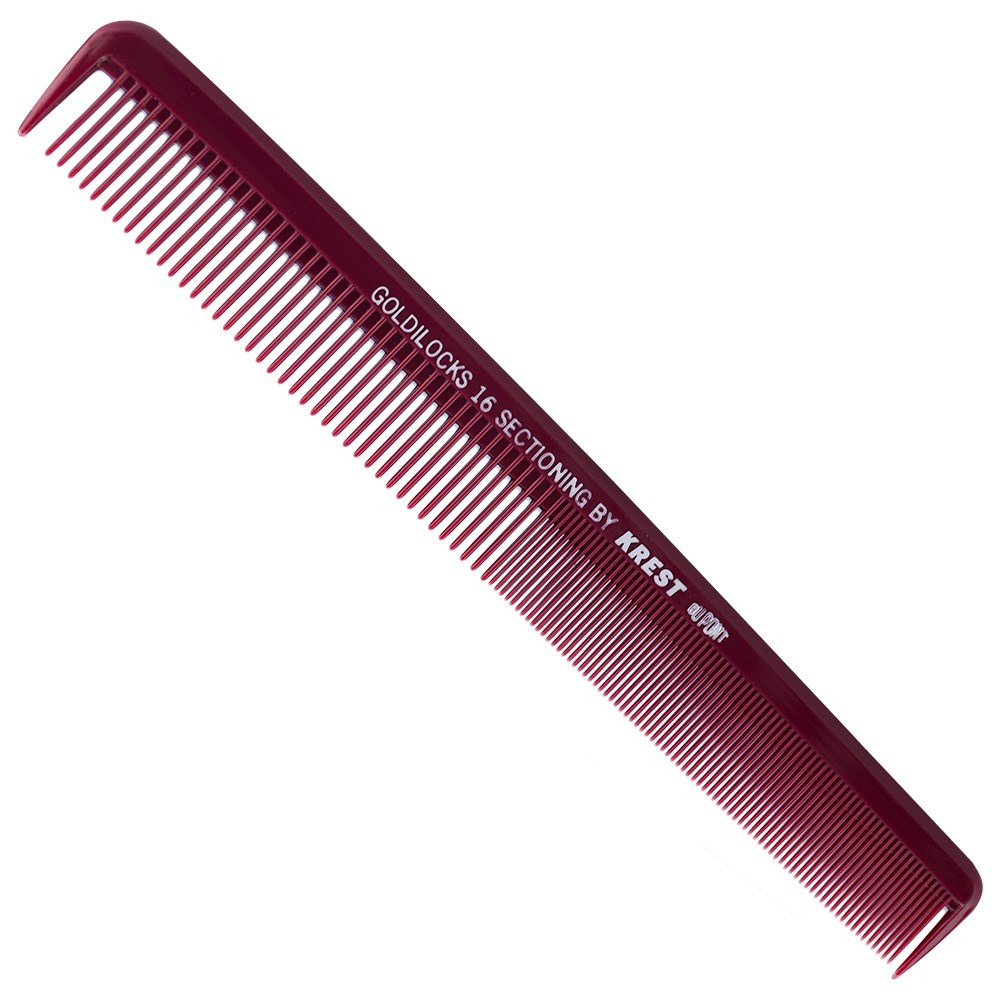 Krest Goldilocks Cutting Comb is made from DuPont Delrin for added strength, low friction and heat resistance. Krest Goldilocks Cutting Comb features wide teeth for low tension combing on thick or curly hair, and fine teeth for precision cutting with tension and control.