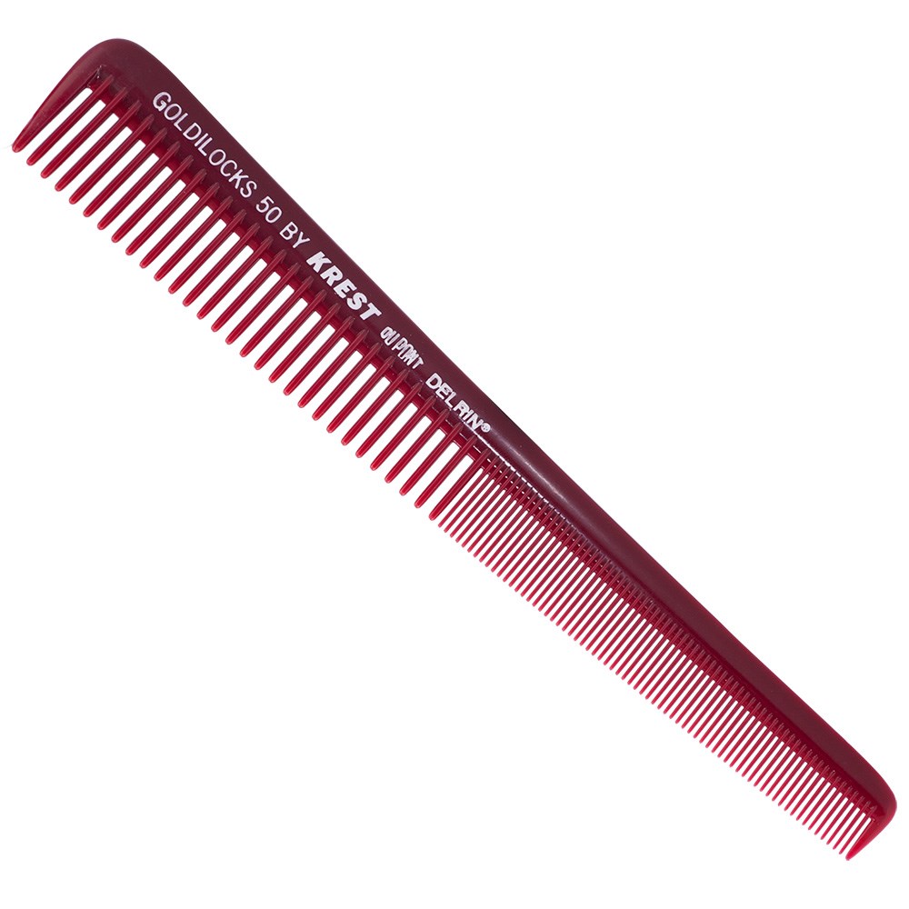 Krest Goldilocks Cutting Comb is made from DuPont Delrin for added strength, low friction and heat resistance. Krest Combs features wide teeth for low tension combing on thick or curly hair, and fine teeth for precision cutting with tension and control.
