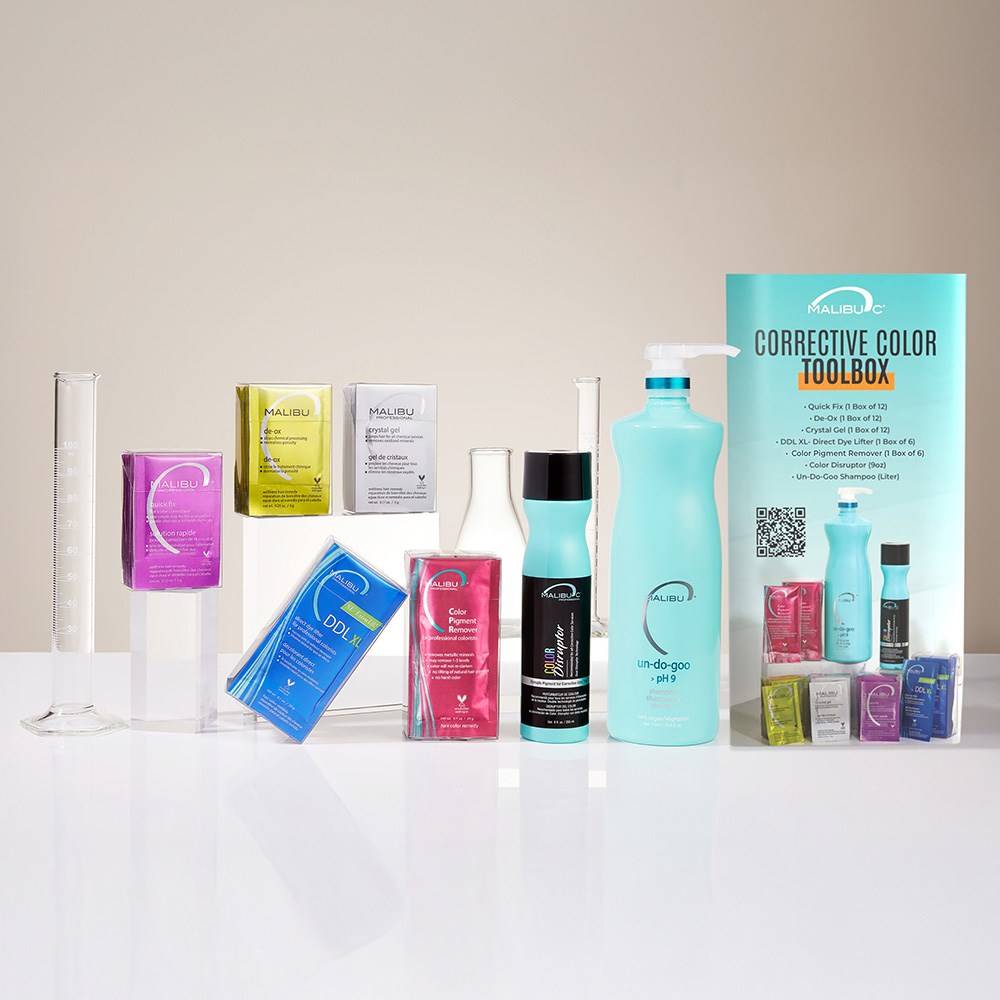 Disrupt and loosen dye with Colour Disruptor, used in conjunction with Colour Pigment Remover to eliminate up to three levels of unwanted oxidised colour. DDL XL Direct Dye Lifter effectively targets hard-to-budge direct dye pigments. Un-Do-Goo Shampoo removes product buildup and serves as the essential first step in any Malibu C salon service. Crystal Gel, Malibu C’s number one in-salon treatment, prepares the hair for all colour and chemical services by removing oxidised minerals. De-Ox stops peroxide processing and normalises porosity, while Quick Fix delivers immediate results by removing over-deposited toner within minutes at the shampoo bowl.