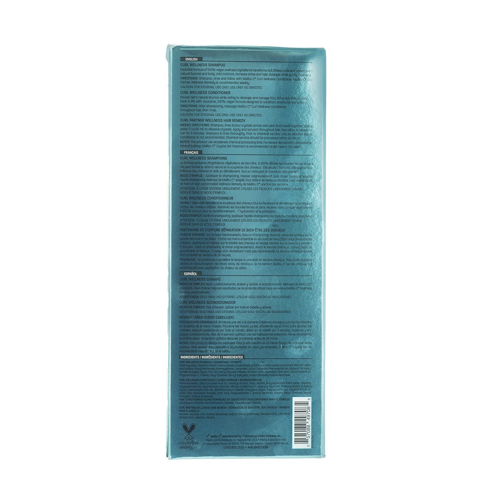 Lost your bounce and shine? Whether your hair is wavy, curly or textured, Malibu C Curl Wellness Collection will take hair from, “No!” to, “Whoa!” with ease. This 100% vegan combo kisses frizz and tangles goodbye while gently removing impurities and buildup. Moisture is locked in to reveal bouncy, shine and voluminous curls and waves which go from day to night. Safe for both natural curls and perms. No sulphates, parabens, gluten or added sodium chloride.