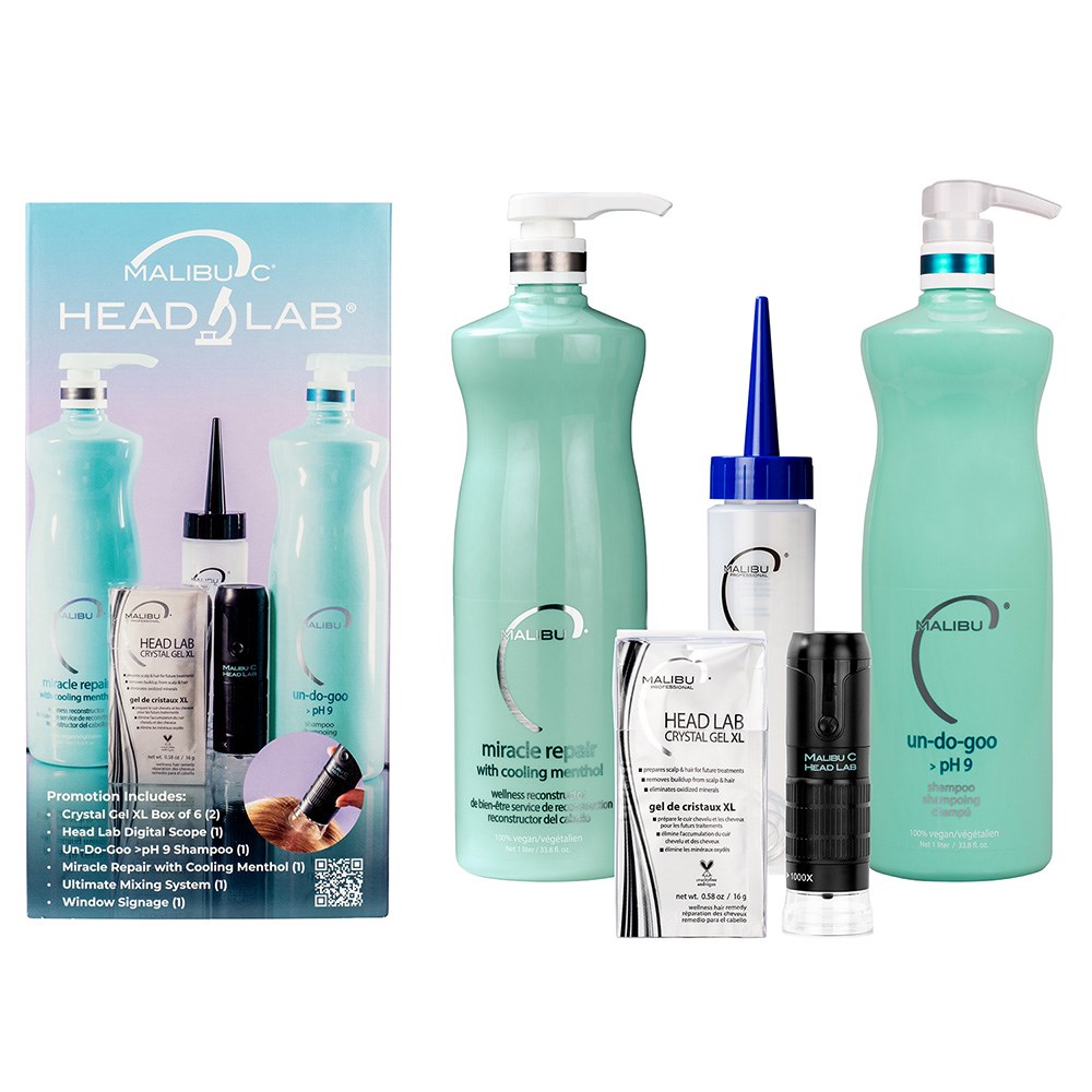 Welcome to Malibu C Head Lab. This Intro Kit is a suite of transformative scalp care solutions and a trackable digital innovation from Malibu C. An unprecedented up-close and personal look at your clients’ scalp to best treat and care for scalp and hair. Everything is here to start this professional journey, including Head Lab Digital Scope, Crystal Gel XL, Un-Do-Goo, Miracle Repair with Cooling Menthol, Ultimate Mixing System and window signage.