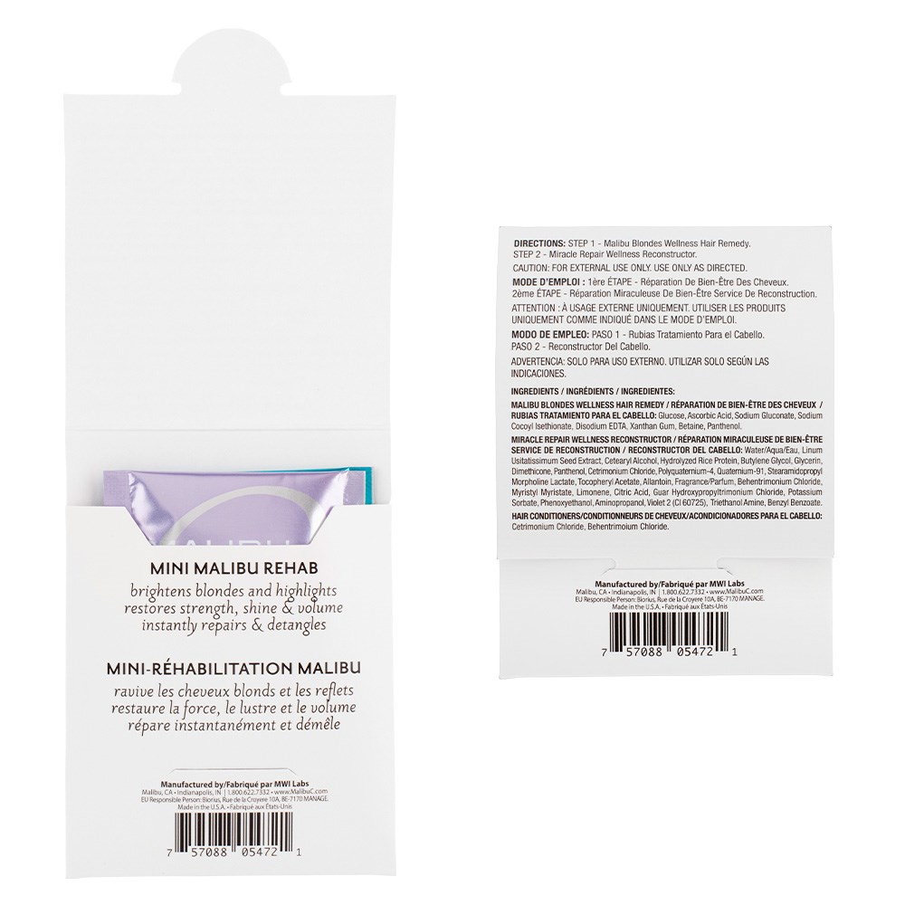 Dial down discolouration and keep hues true. Malibu C Mini Malibu Rehab Malibu Blondes Hair Treatment 12pc is a freshly activated antioxidant complex formulated to draw out damaging mineral impurities and eliminate unwanted brassy tones. This original set of 2 sachets includes Malibu C Malibu Blondes Hair Treatment and Miracle Repair Reconstructor. Cruelty-free, vegan and made in the USA. Formulated without sulphates, surfactants, gluten and paraben.