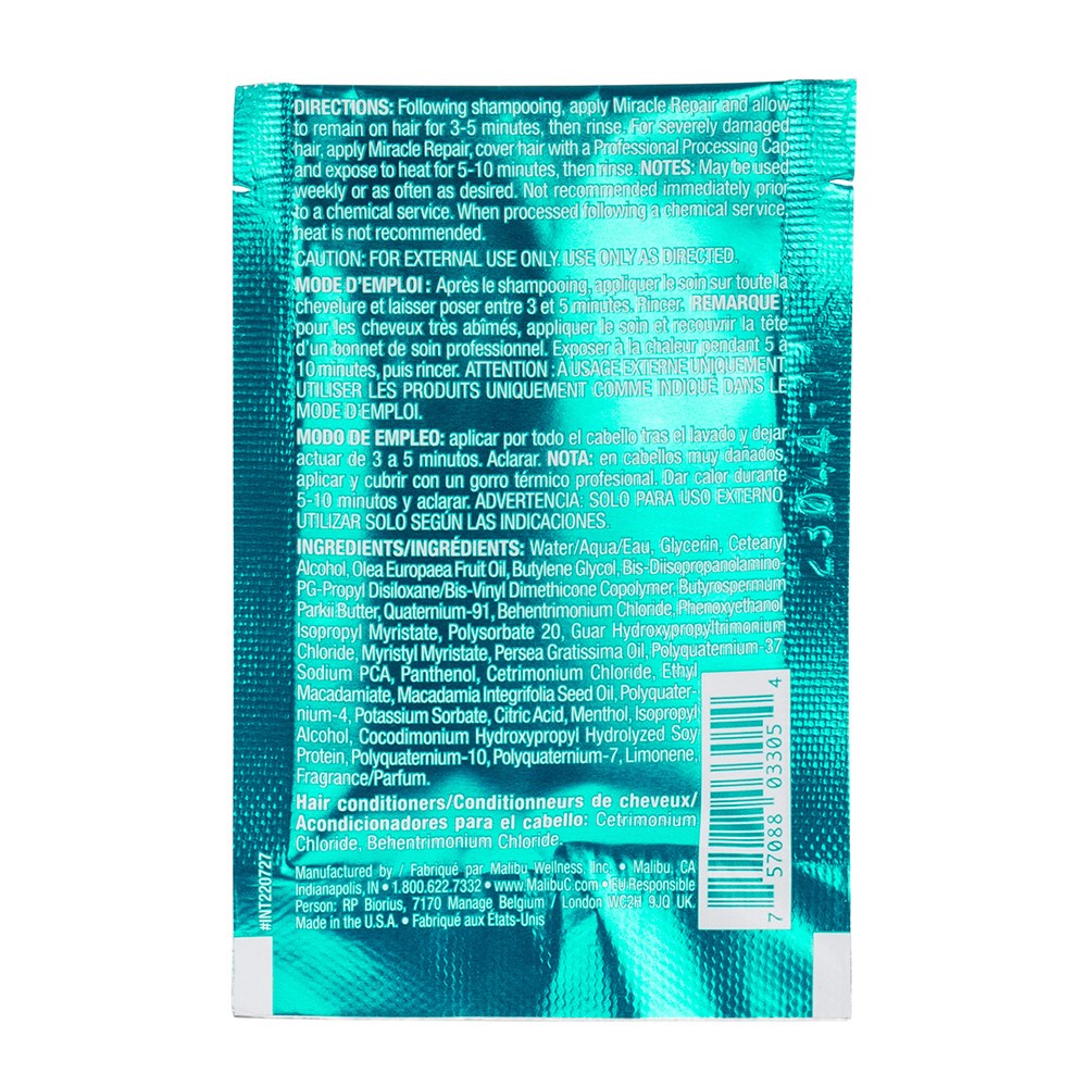 Malibu C Miracle Repair Cooling Hair Treatment 12pc seeks out hair’s weak areas and is an essential step of the unrivalled Malibu C Head Lab. Immediately repair weak, damaged hair. Restore manageability and instantly detangle. A mega-dose of gluten-free plant proteins, including flax protein, quinoa protein and rice protein, penetrates deep into the hair shaft. Enriched with provitamin B5 for vital moisture. Nourish and protect every strand of hair against further damage. Menthol cools and also soothes the skin. 100% vegan and cruelty-free.