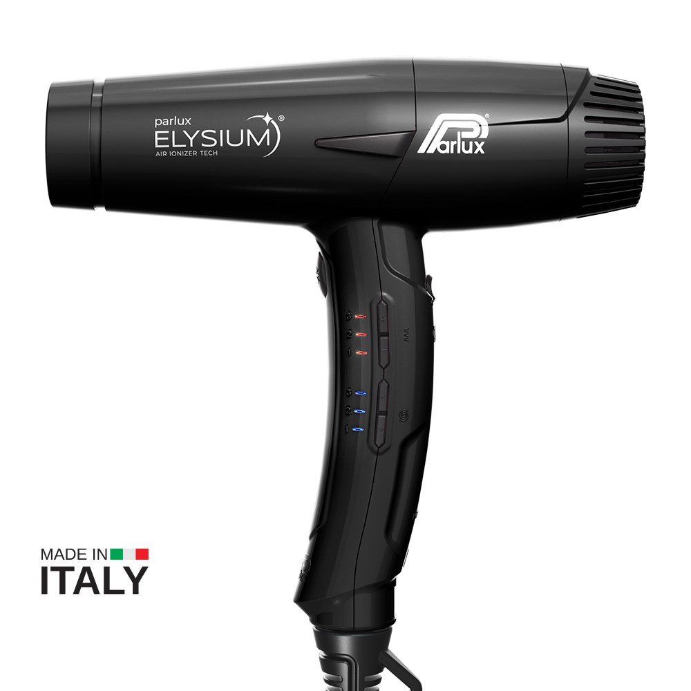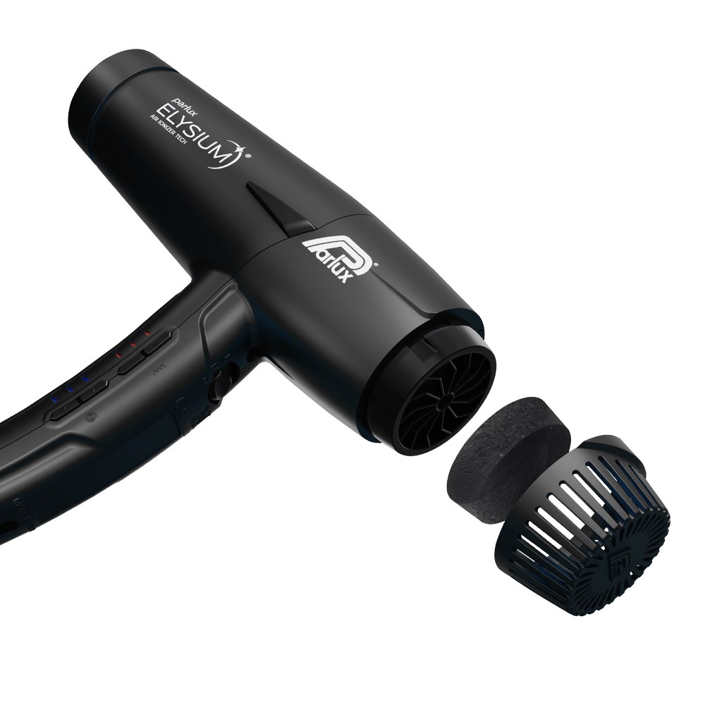 The first Parlux digital mini hair dryer. Designed to meet the needs of professionals, Parlux Elysium Hair Dryer is a futuristic experience. Delivering outstanding reliability, Parlux Elysium Hair Dryer is small, light and powerful. Professional digital oversized mini-motor with a powerful 2,300 watts and 80m3/h airflow. 3 speed and 3 temperature settings for 9 versatile combinations. Air Ionizer Tech ionic technology for smoother, sleeker results. Lightweight and perfectly balanced with an ergonomic handle. Quick and easy cleaning with washable and replaceable sponge filter. Includes 3 concentrator nozzles, 2 of which are new AirFusion nozzles to optimise airflow for faster, more precise styling with enhanced shine. Made in Italy.