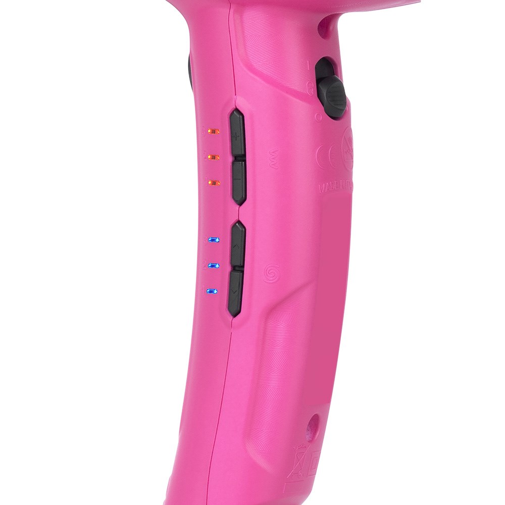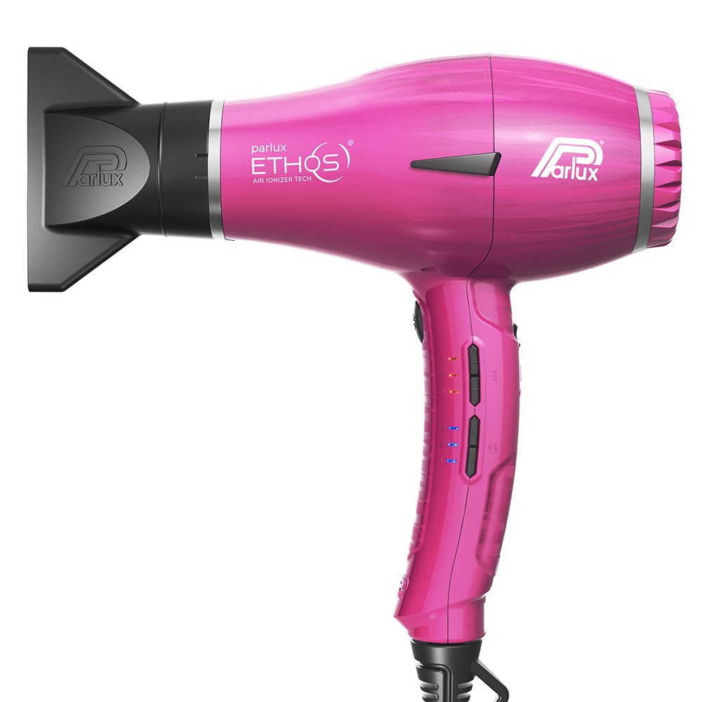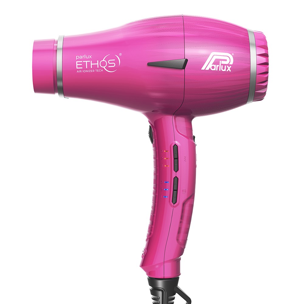 Express your talent by exploring new stylistic universes. Parlux Ethos Hair Dryer Fuchsia embodies digital excellence for styling without boundaries. Classic design meets digital innovation, delivering astounding performance, durability, lightness and power. Improve and customise your blow-drying experience. Professional digital motor with 2,300 watts and 88m³/h airflow for flawlessly fast drying. Nine combinations of temperature and speed. Air Ionizer Tech ionic technology for superbly silky results. Anti-heating front body, lightweight, perfectly balanced with an ergonomic handle. Patented special twisting cable offers unprecedented freedom of movement, allowing the cable to freely rotate 360°. Designed with exclusive texture and antibacterial paint. Two nozzles, including new slim, straightener effect nozzle.